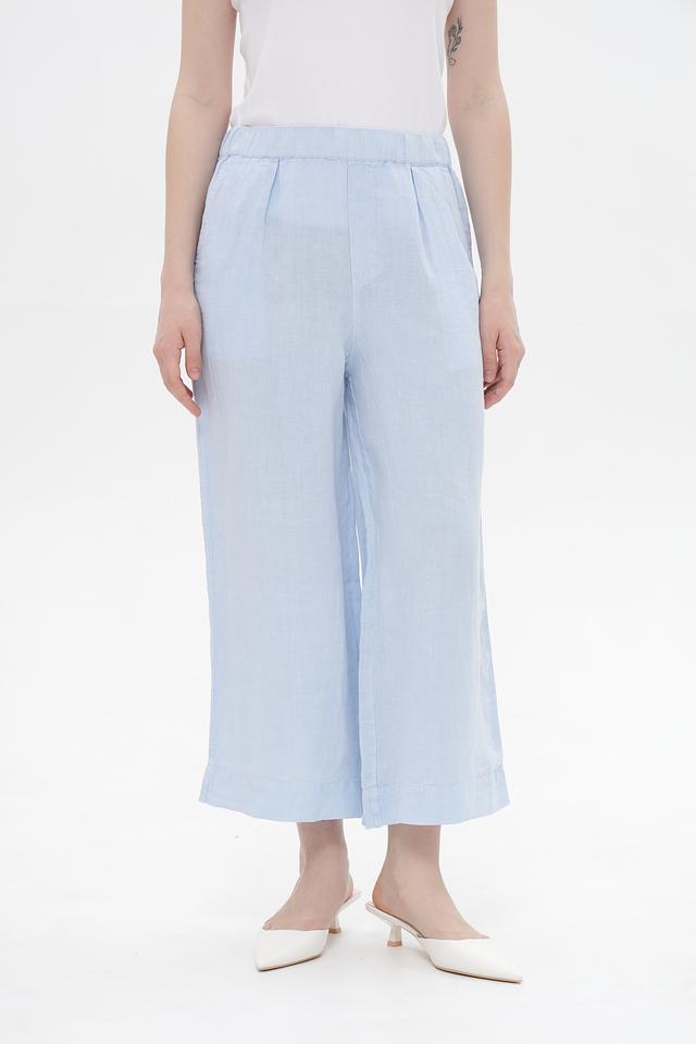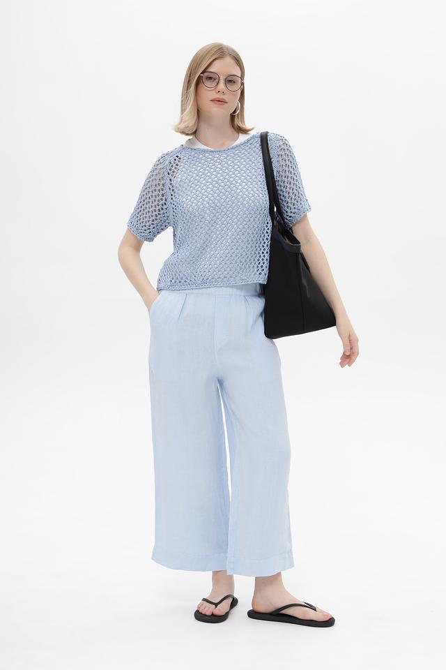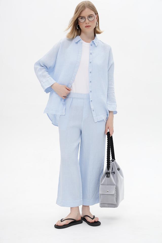 Женские брюки клёш от Oui голубого цвета, выполнены из 100% льна. Модель с эластичным поясом и боковыми карманами обеспечит комфорт в жаркую погоду. Состав: лен 100%