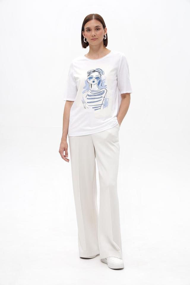 Особенностью данной модели является яркий и стильный принт с изображением девушки в берете и солнцезащитных очках, выполненный в голубых тонах. Этот принт добавляет футболке оригинальности и индивидуальности.