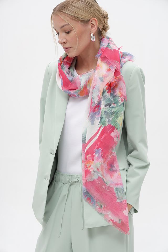 Дизайн шарфа представлен абстрактным цветочным принтом, сочетающим в себе оттенки розового, красного, голубого и зеленого. Такое сочетание цветов делает этот аксессуар универсальным и подходящим для различных стилей одежды.