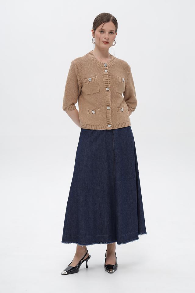 Жакет застегивается на ряд декоративных пуговиц, украшенных стразами, что придает изделию элегантный и изысканный вид. Два накладных кармана добавляют практичности и завершают дизайн.