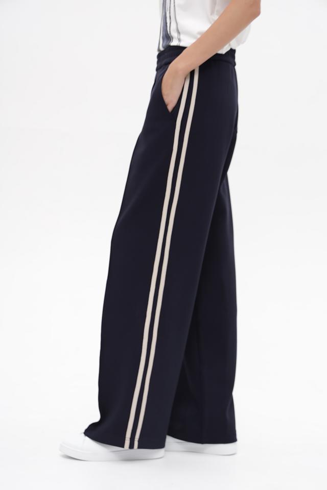 Представляем стильные брюки клёш от бренда Oui. Модель выполнена в тёмно-синем цвете и отличается лаконичным дизайном с контрастными полосками по бокам, добавляющими динамики образу.