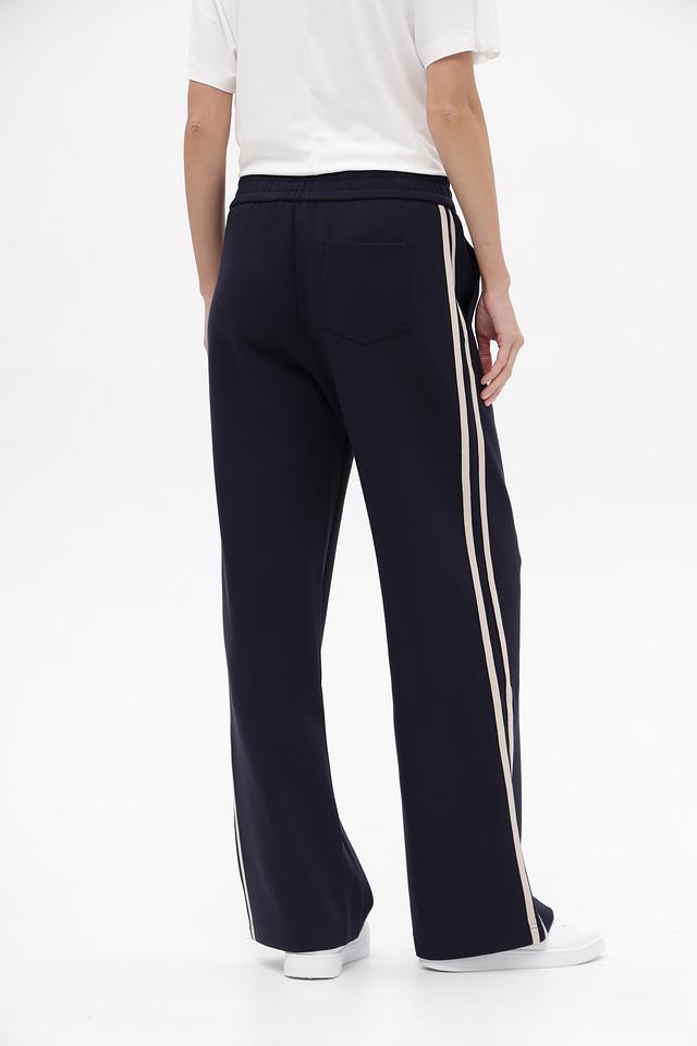 Стильные брюки клёш от Oui тёмно-синего цвета с контрастными полосками по бокам. Изготовлены из смеси полиэстера и вискозы с добавлением эластана для комфорта и свободы движений. Состав: полиэстер 49%, вискоза 46%, эластан 5%