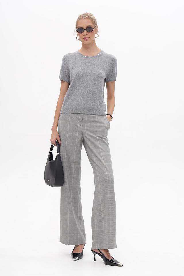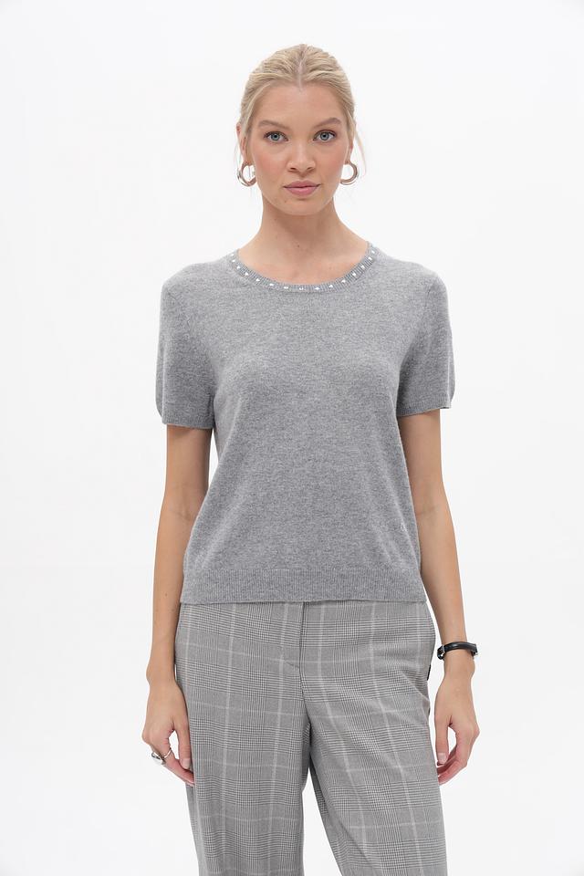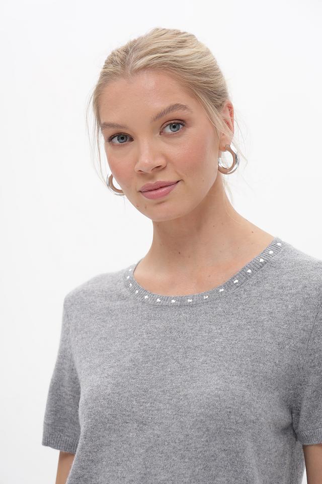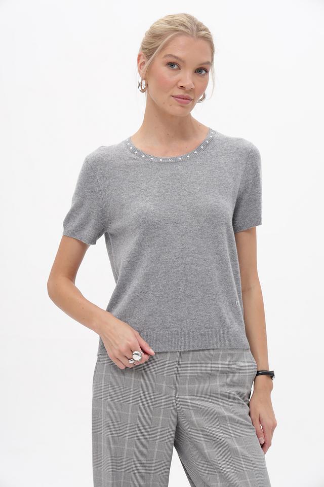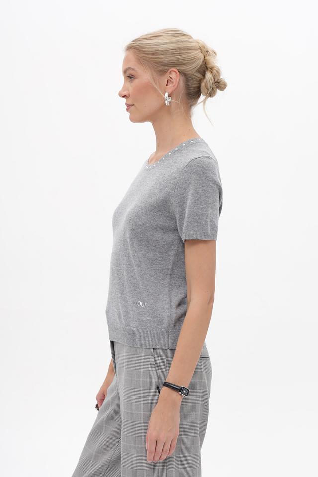 Серый пуловер от Oui с коротким рукавом и деликатной отделкой из жемчуга. Изготовлен из мягкой смеси натуральных и синтетических волокон, обеспечивающей комфорт и удобство в носке. Состав: полиамид 45%, вискоза 30%, шерсть 20%, кашемир 5%