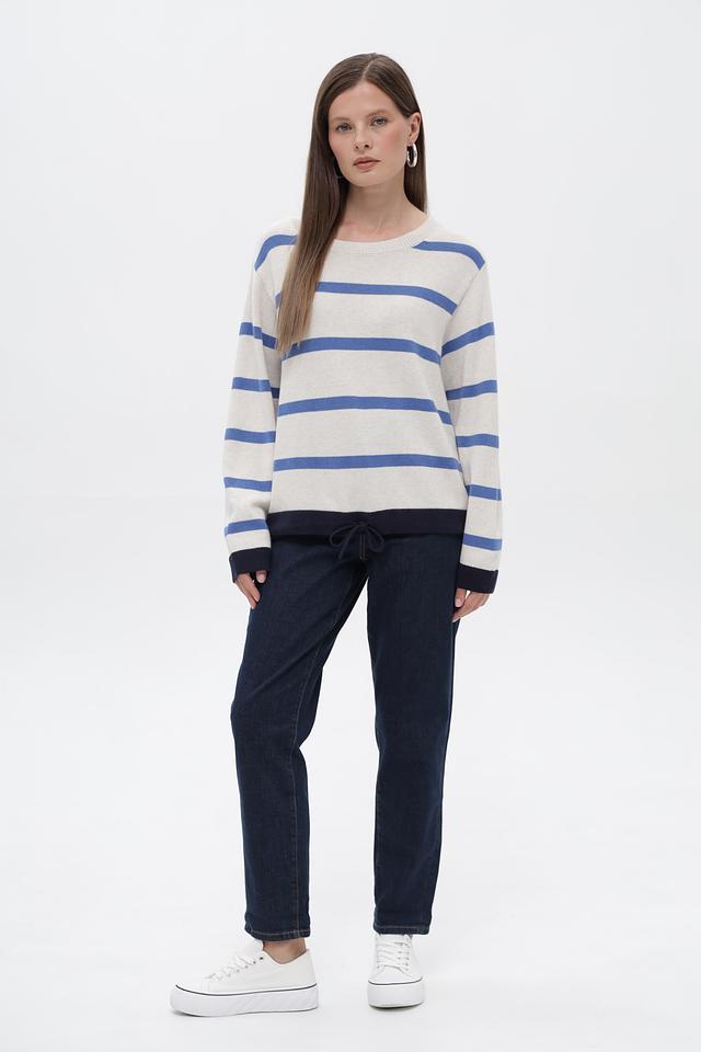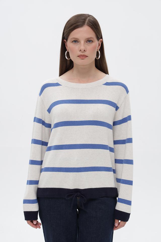 Женский пуловер от бренда Oui выполнен в бежевом цвете с горизонтальными полосами синего и тёмно-синего оттенков. Модель имеет круглый вырез горловины и длинные рукава.