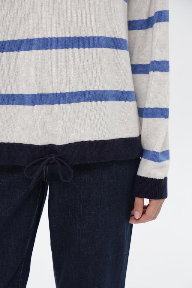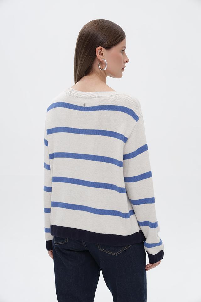Бежевый пуловер от Oui с горизонтальными полосами синего и тёмно-синего цветов. Изготовлен из мягкого трикотажа с добавлением хлопка, вискозы и полиамида. Состав: полиамид 43%, хлопок 30%, вискоза 27%