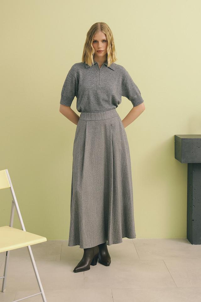 Пуловер имеет короткий рукав и воротник-поло с застежкой-молнией, что позволяет регулировать глубину выреза.
