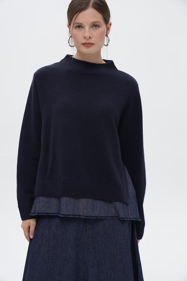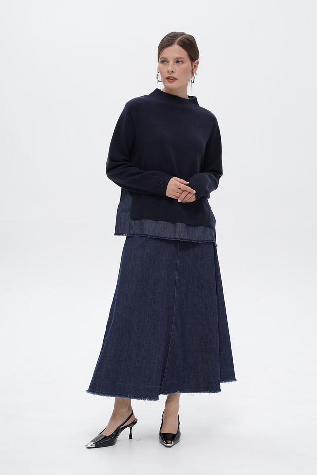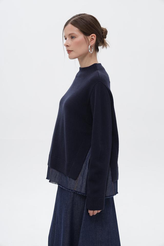 Пуловер имеет воротник-стойку, придающий образу элегантность. Длинные рукавы с манжетами дополняют силуэт. Джинсовая вставка выполнена из качественного денима с необработанными краями, создавая эффект лёгкой небрежности.