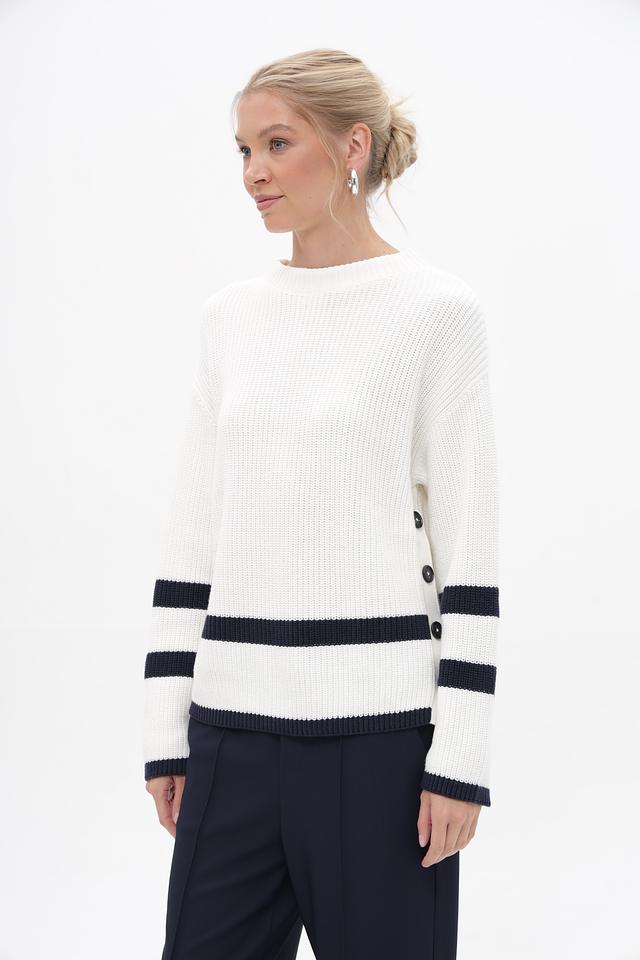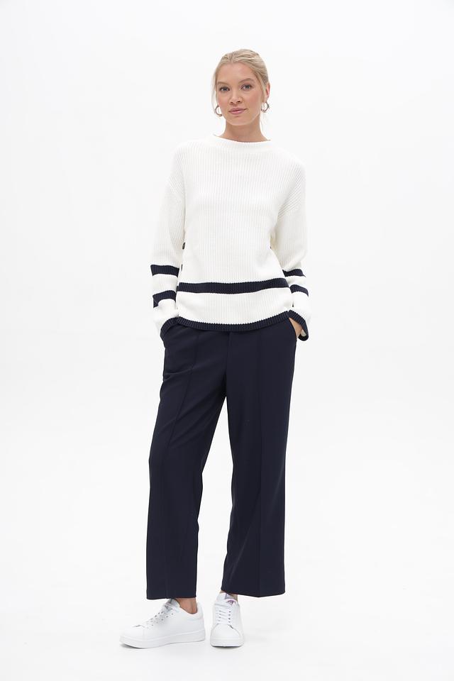 Белый пуловер Oui с контрастными темно-синими полосками. Модель выполнена из 100% хлопка, обеспечивающего комфорт и приятные ощущения при носке. Удобный крой и стильный дизайн. Состав: хлопок 100%