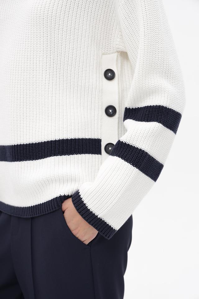Этот стильный пуловер от бренда Oui станет отличным дополнением к вашему гардеробу. Изделие выполнено в белом цвете с широкими темно-синими полосами, расположенными на рукавах и в нижней части изделия, что придает ему особый шарм.