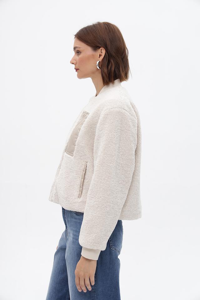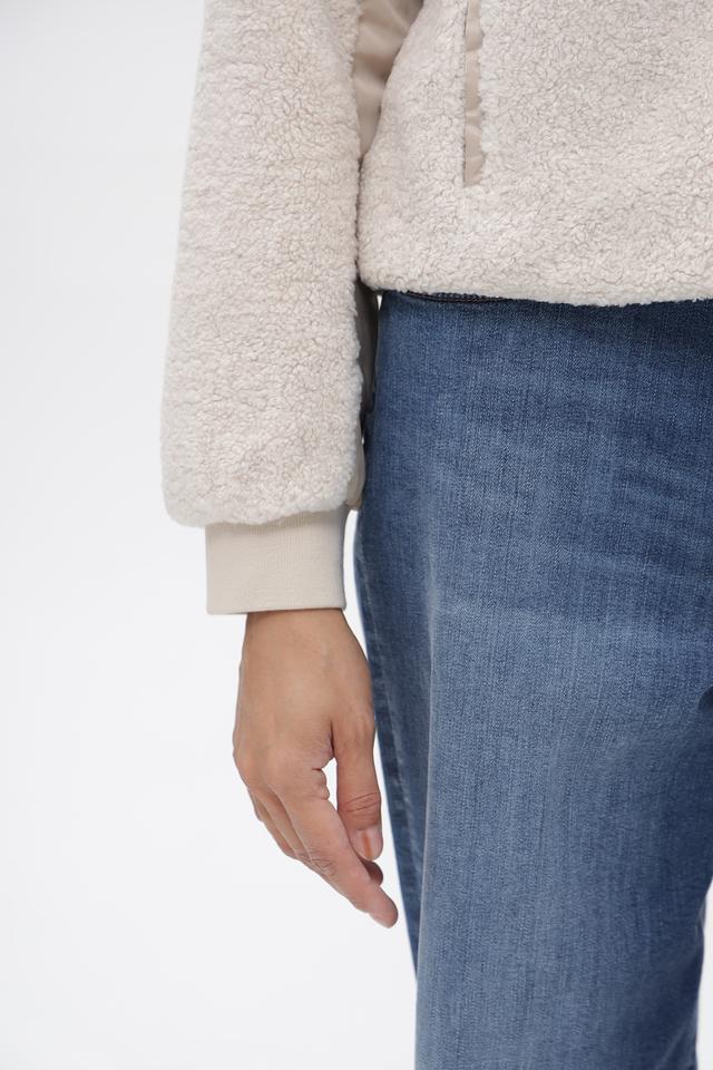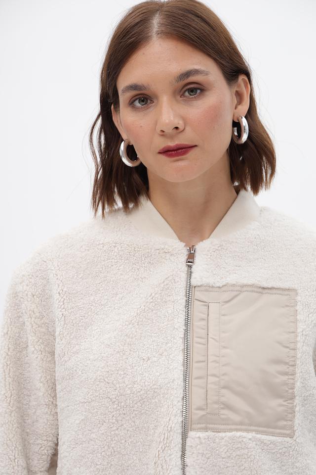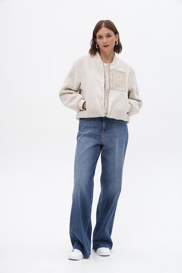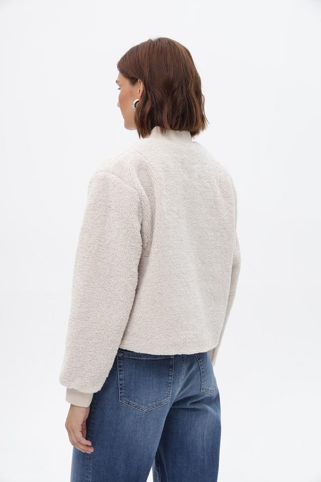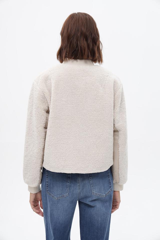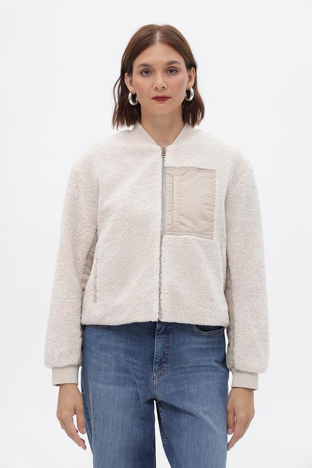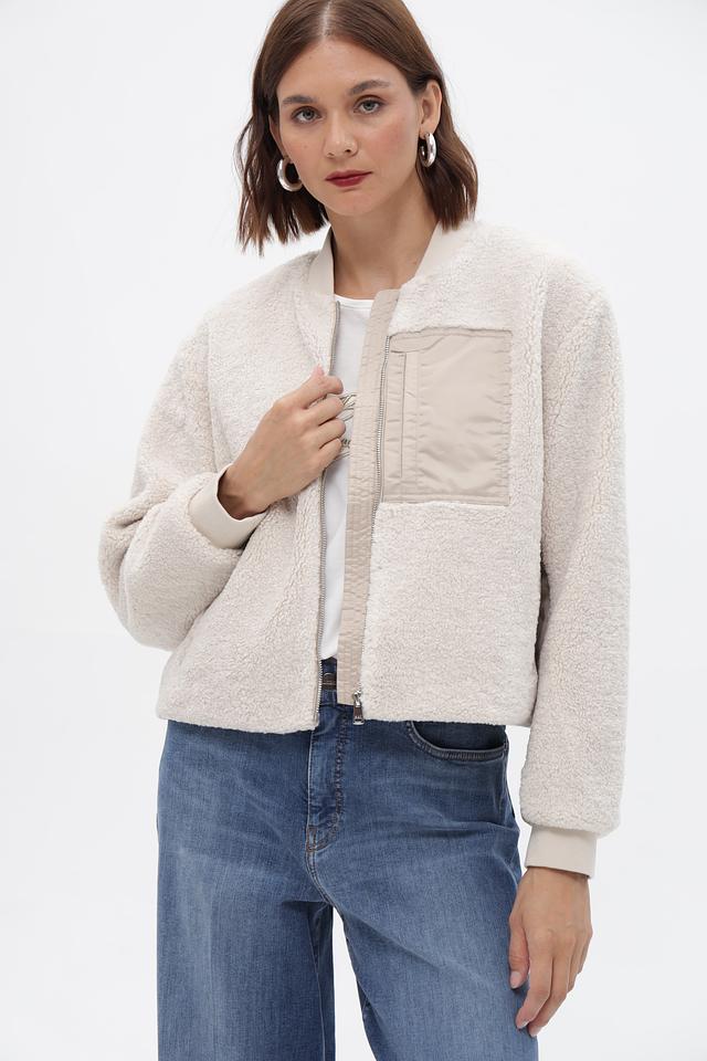 Жакет Oui бежевого цвета выполнен из мягкого искусственного меха. Модель на молнии с воротником-стойкой и накладным карманом, идеально подходит для создания уютных образов. Состав: полиэстер 100%