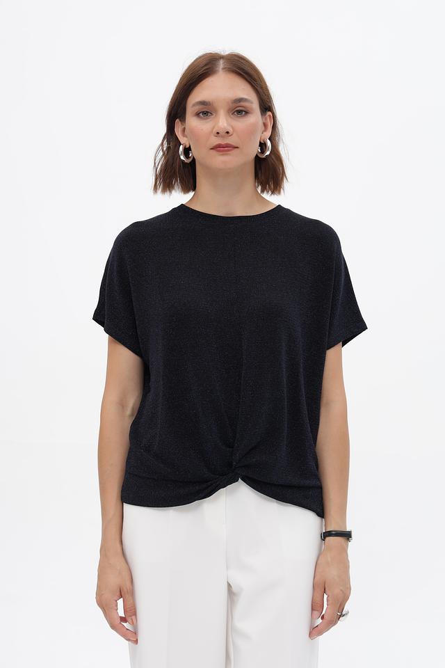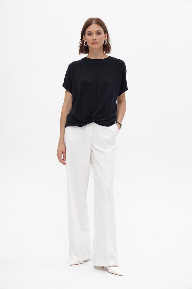 Круглый вырез горловины и короткие рукава делают силуэт легким и воздушным. Оригинальный узел на подоле придает блузке особый шарм и подчеркивает талию.