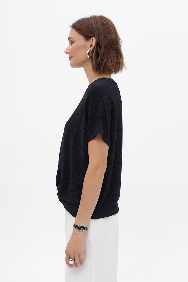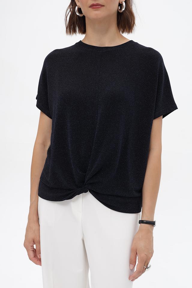 Стильная блузка Oui темно-синего цвета с узлом на подоле. Изготовлена из полиамида с добавлением эластана и металлизированной нити, что придает ей благородный блеск. Идеальный вариант для создания элегантного повседневного образа. Состав: полиамид 67%, метализ.нить 28%, эластан 5%