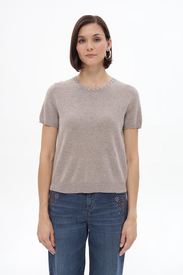 Бежевый пуловер от Oui из смесового трикотажа с коротким рукавом и декором из жемчуга. Состав: 45% полиамид, 30% вискоза, 20% шерсть, 5% кашемир. Состав: полиамид 45%, вискоза 30%, шерсть 20%, кашемир 5%