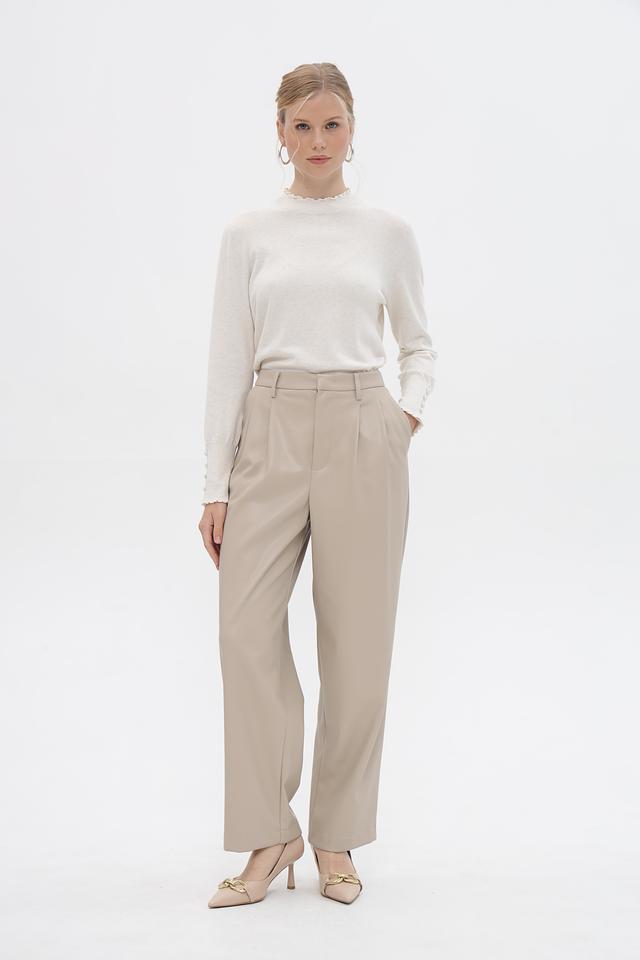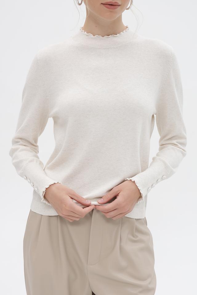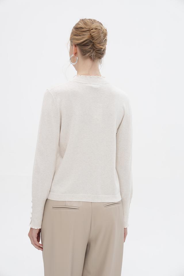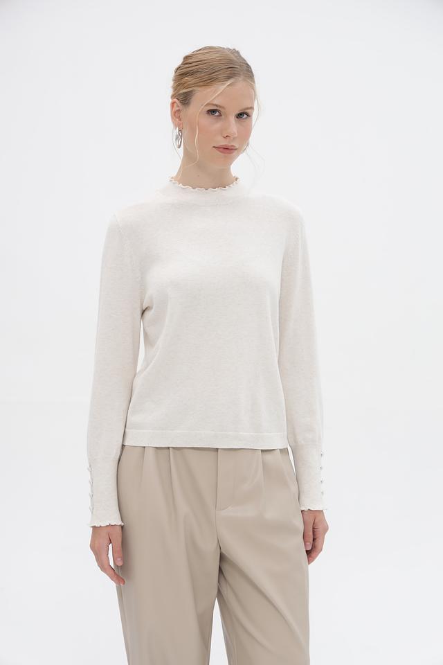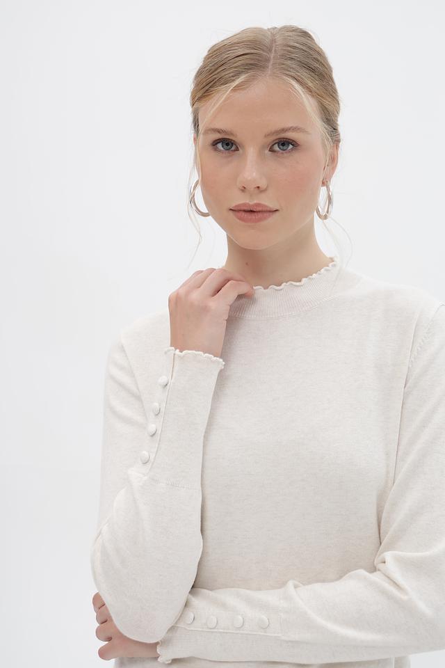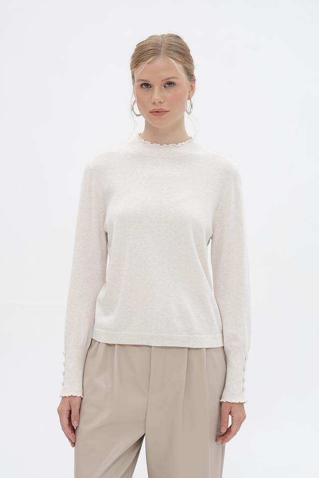 Женский пуловер Oui выполнен в нежном бежевом оттенке. Модель имеет классический силуэт и длинные рукава, дополненные изящным воланом по краю. Горловина также оформлена воланом, что придает изделию романтичный и женственный вид.