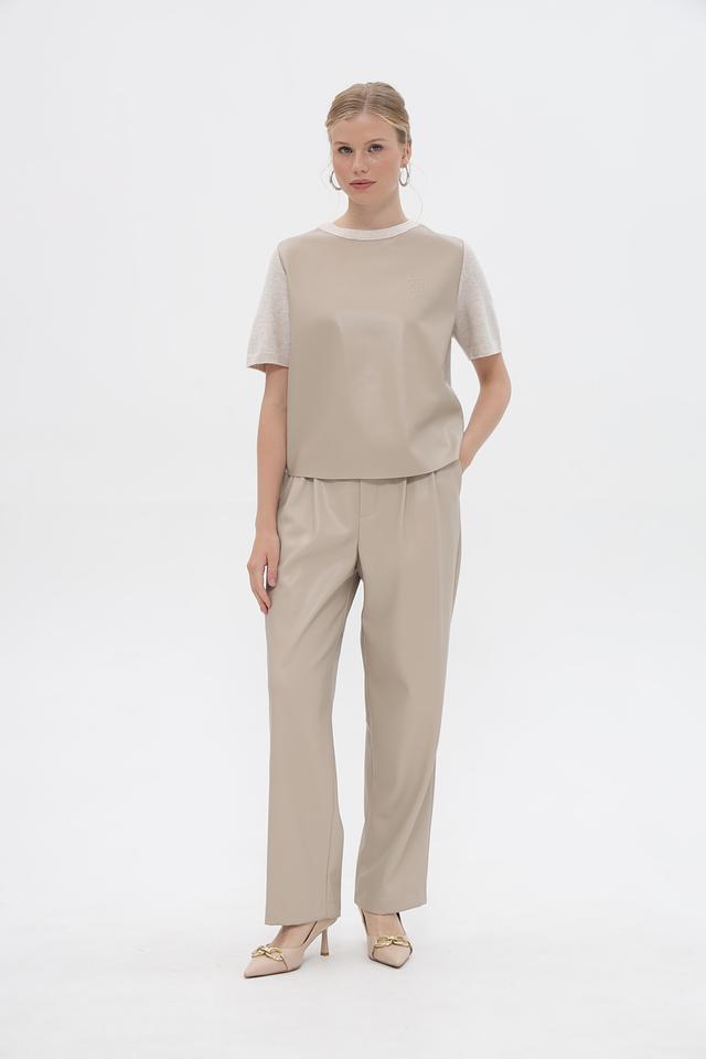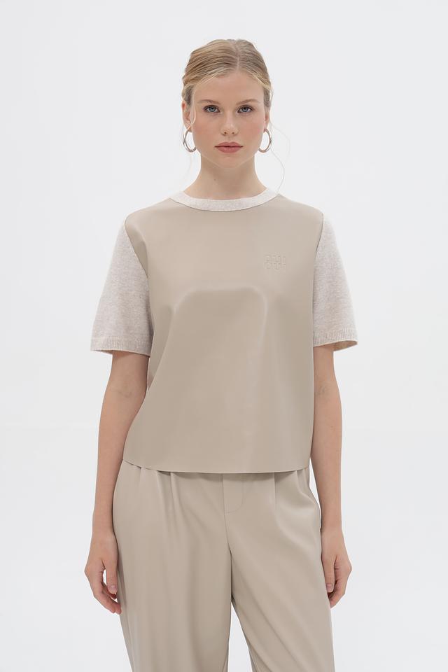 Передняя часть и верх рукавов выполнены из материала, напоминающего кожу, а задняя часть и нижняя часть рукавов – из вязаного трикотажа. На передней части пуловер украшен тисненым логотипом бренда Oui. Круглый вырез горловины и короткие рукава делают этот пуловер идеальным для теплой погоды.