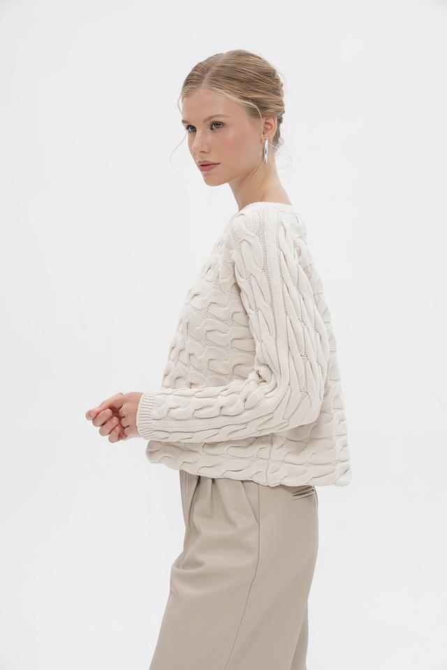 Пуловер имеет круглый вырез и длинные рукава, а его особенностью является выразительный узор в виде кос, который придает изделию оригинальность и текстуру. Прилегающий силуэт подчеркивает фигуру, не сковывая движения.