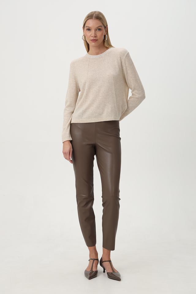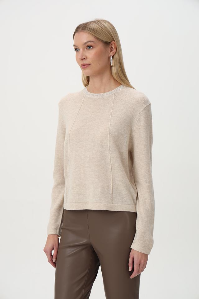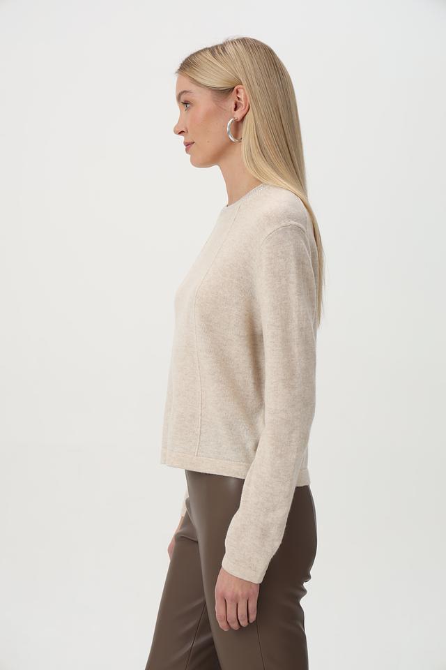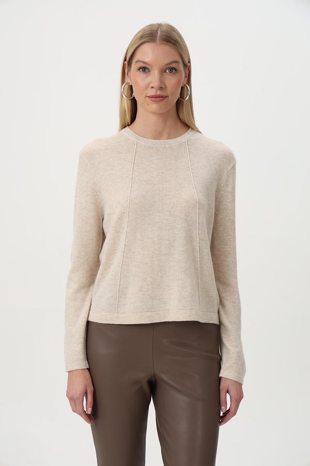 Пуловер имеет прямой крой и длинные рукава. Особенностью модели является декоративная отделка горловины, которая придает изделию элегантный вид.