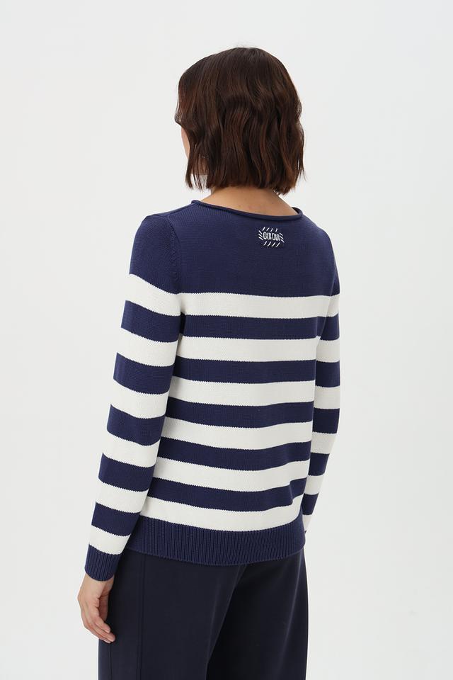Этот пуловер от бренда Oui – прекрасный выбор для создания повседневного образа. Модель выполнена в классическом стиле с горизонтальной полоской синего и белого цветов.