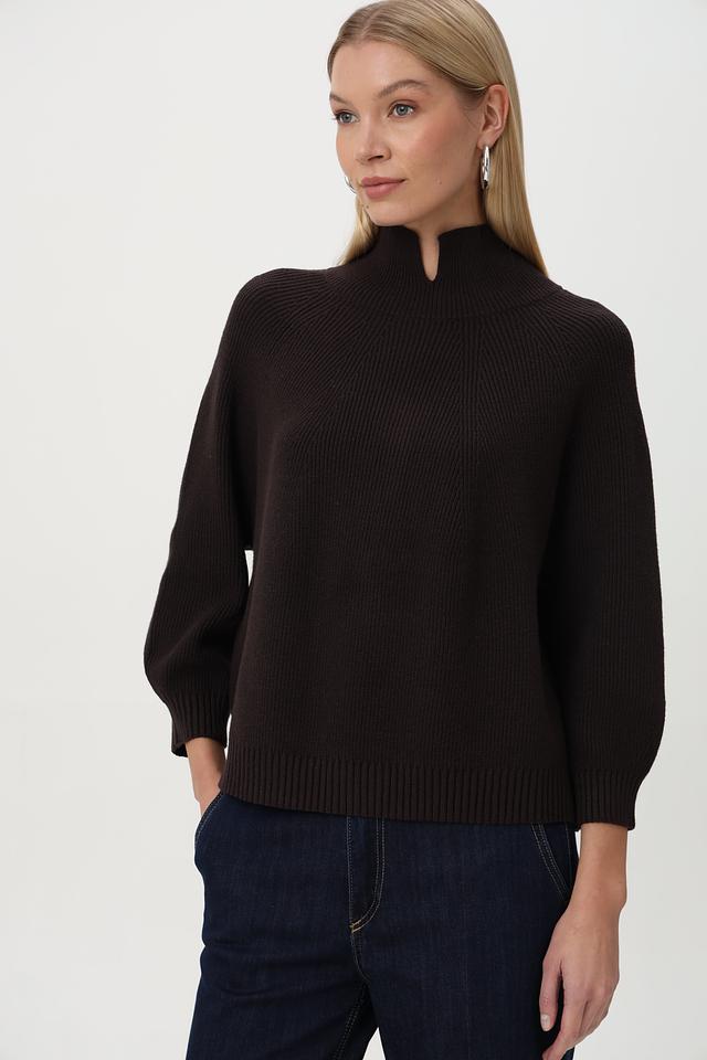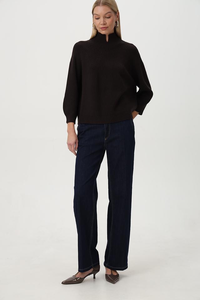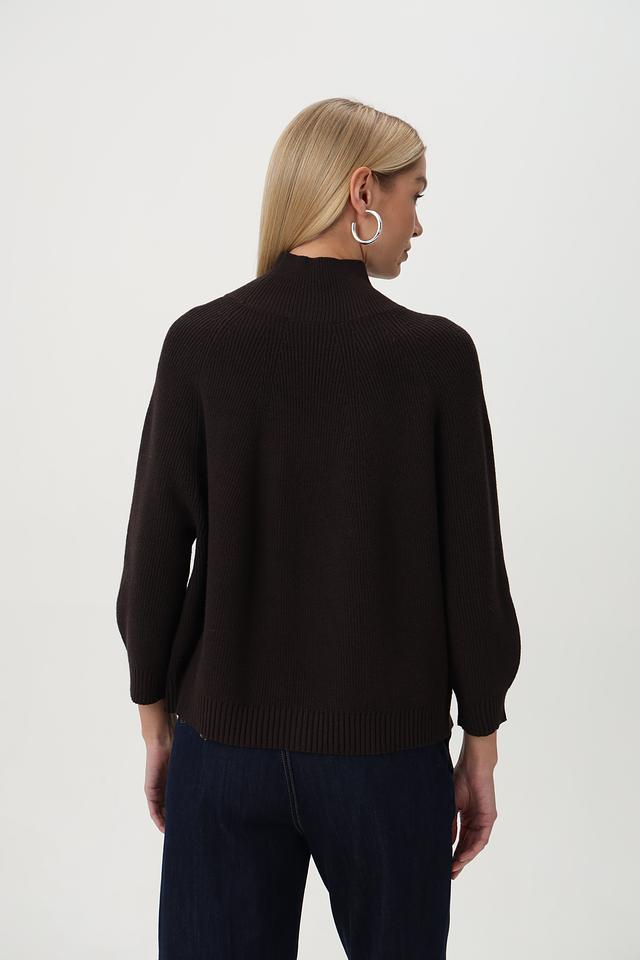 Темно-коричневый пуловер Oui с оригинальным воротником-стойкой. Выполнен из мягкой смеси вискозы, полиэстера и полиамида. Умеренный объём и рукава 3/4. Состав: вискоза 50%, полиэстер 28%, полиамид 22%