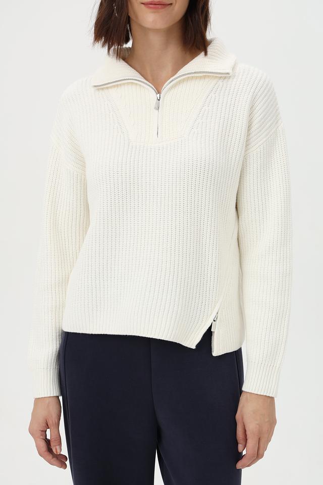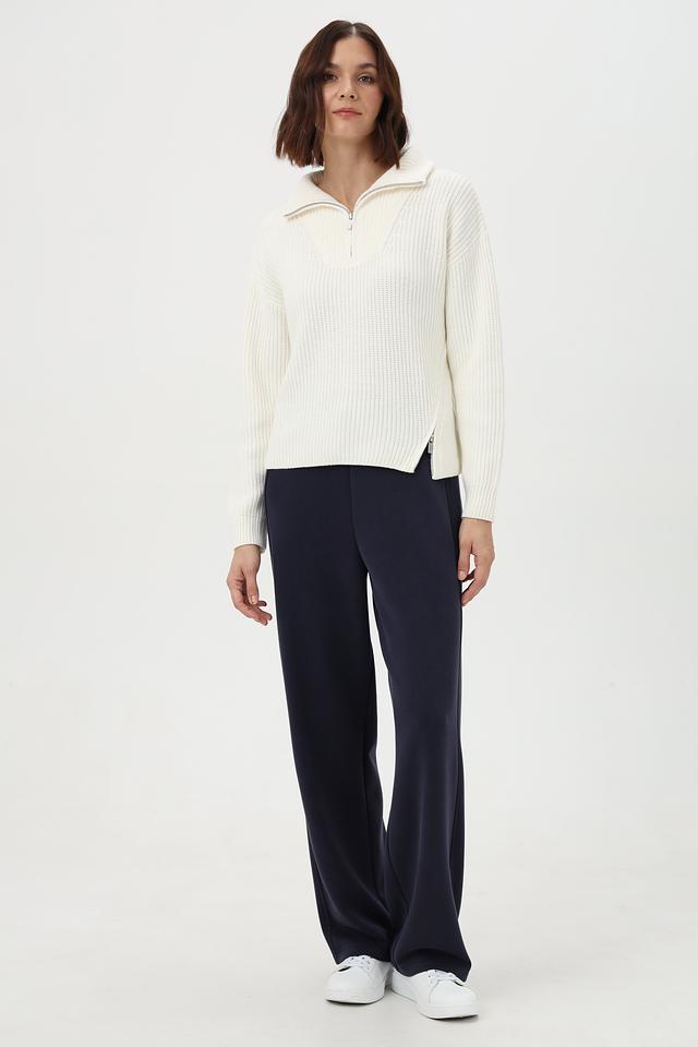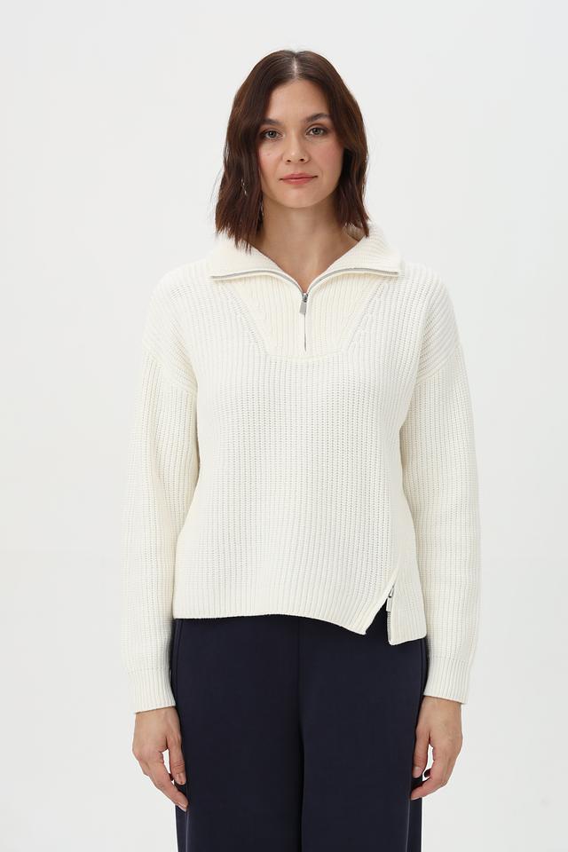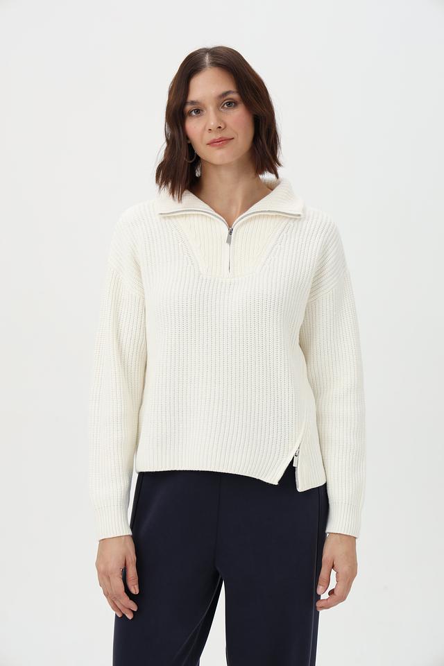 Вязаная фактура придает изделию уютный вид. Небольшой разрез с молнией по низу изделия добавляет оригинальности. Пуловер станет отличным выбором для создания повседневных образов.