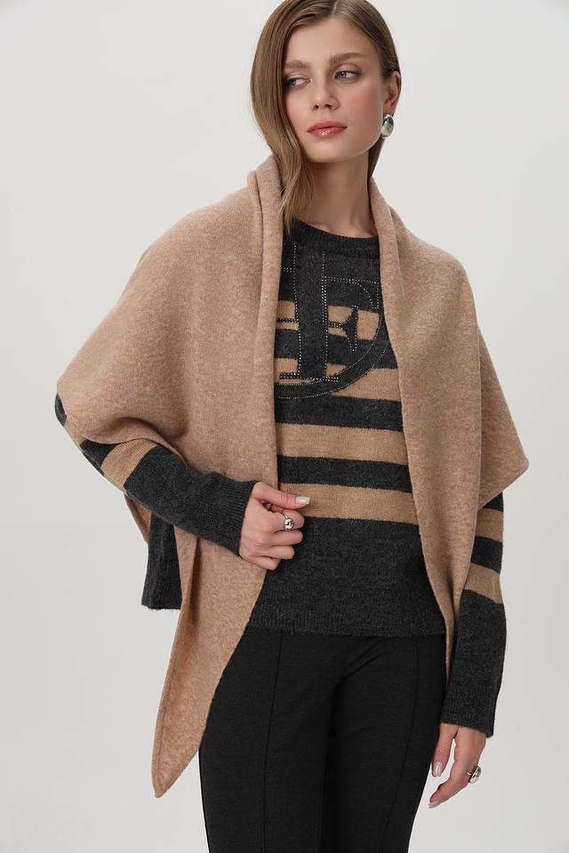 Модель выполнена в форме трапеции, что позволяет носить её различными способами: как шарф, накидку или палантин.