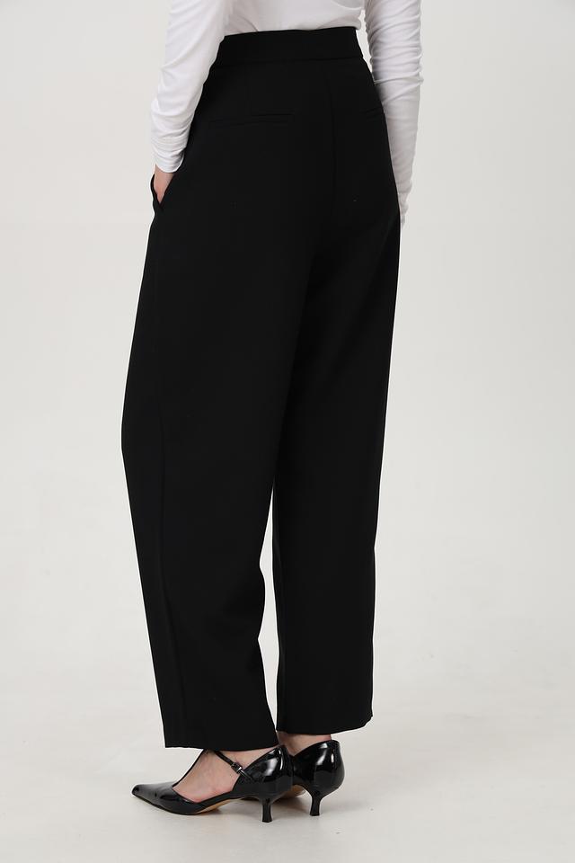 Брюки имеют прямой крой и высокую посадку, обеспечивая комфортную посадку по фигуре. Пояс дополнен застежкой-молнией и крючком, что обеспечивает надежную фиксацию. Наличие боковых карманов добавляет практичности.