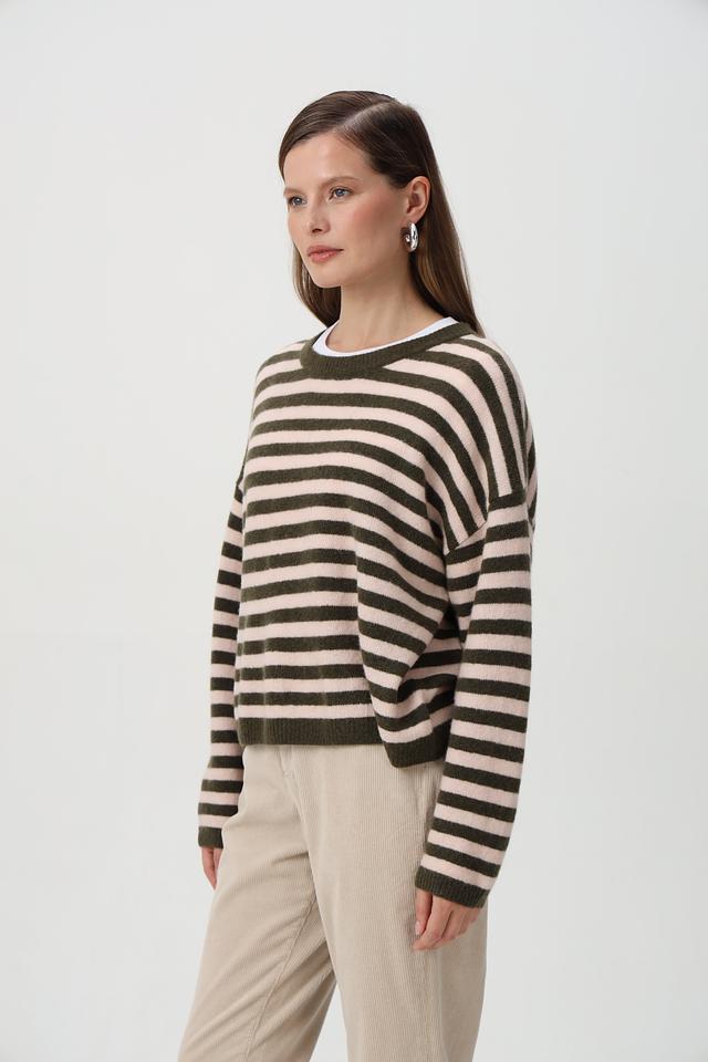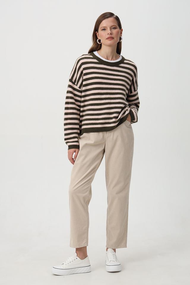 Женский пуловер Oui зеленого и бежевого цвета в классическую полоску. Изготовлен из мягкой шерсти с добавлением полиамида и других синтетических волокон для комфорта и долговечности. Состав: полиамид 44%, шерсть 32%, полиэстер 21%, эластан 3%