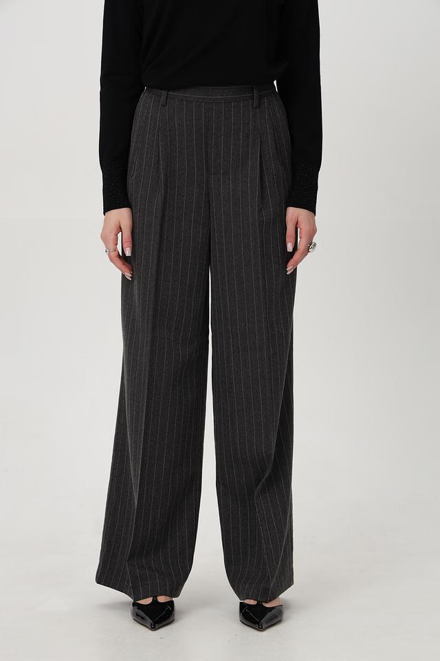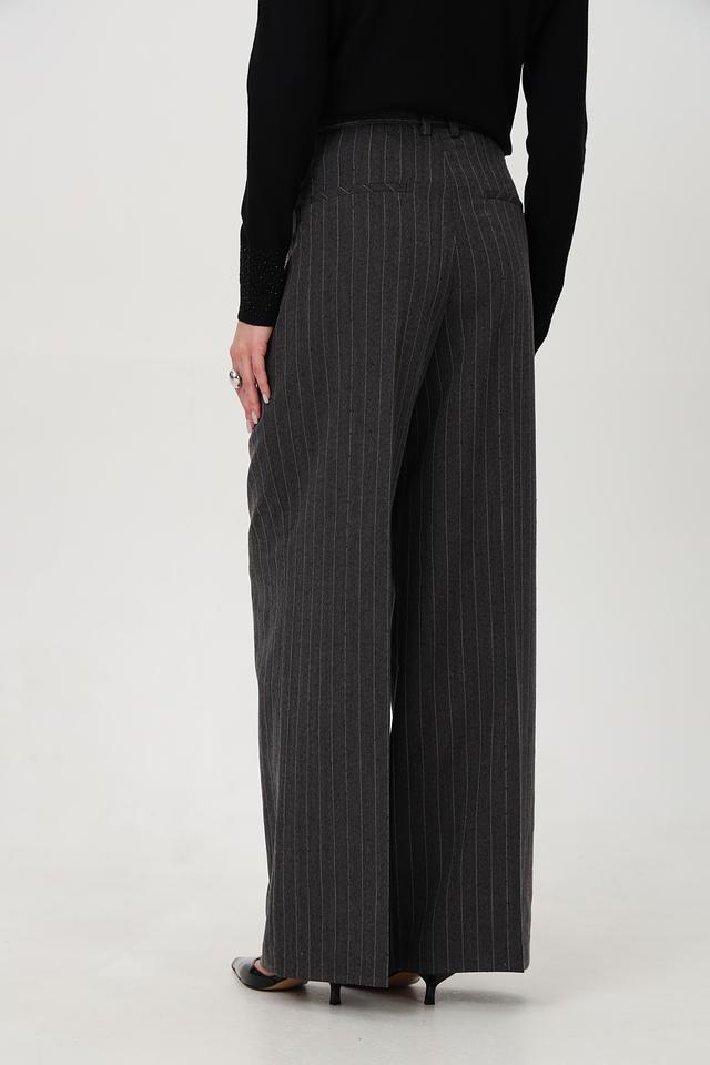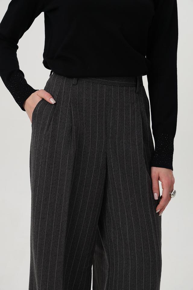 Брюки имеют свободный крой и высокую посадку, что обеспечивает комфортную посадку по фигуре. Наличие боковых карманов и защипов добавляет функциональности и изысканности.