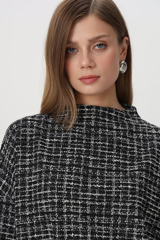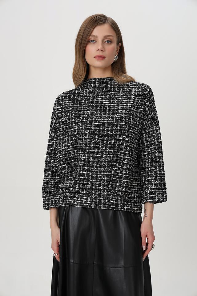 Изысканный пуловер от бренда Oui выполнен в классической чёрно-белой клетке, придающей ему элегантный и универсальный вид.