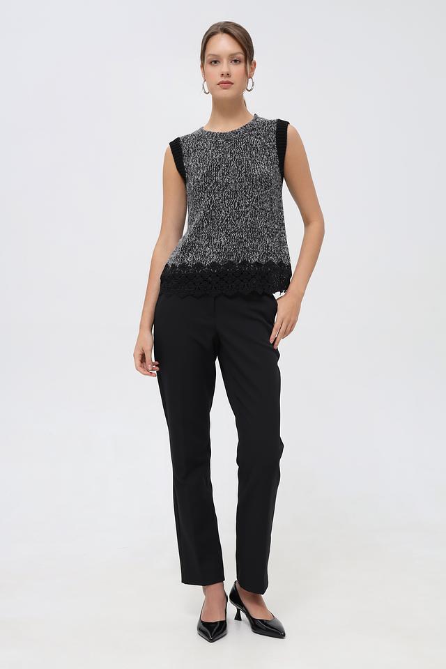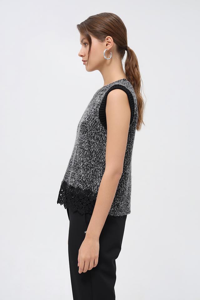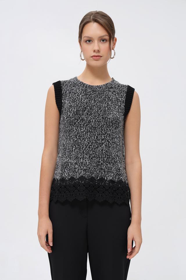 Этот жилет от бренда Oui станет стильным акцентом в вашем гардеробе. Модель выполнена в черном цвете с оригинальной текстурной вязкой и эффектной отделкой из кружева по низу.