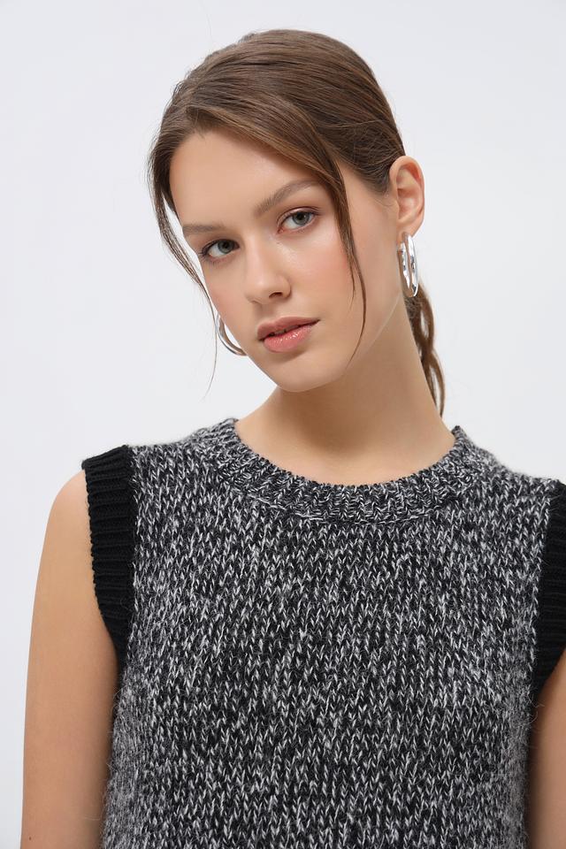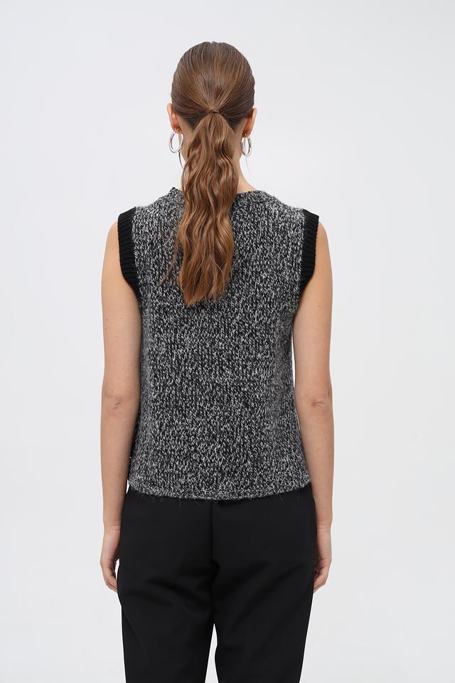 Жилет имеет круглый вырез горловины и прямой крой. Отсутствие рукавов делает его идеальным вариантом для создания многослойных образов.