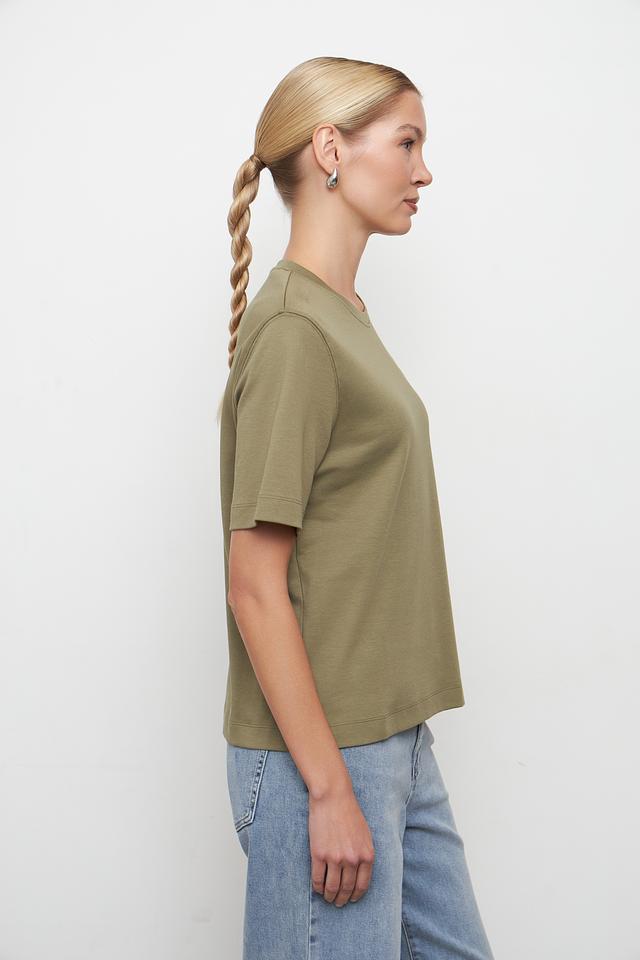 Футболка имеет прямой крой, который подходит для большинства типов фигур. Короткий рукав и классический круглый вырез горловины придают ей лаконичный и современный вид. Минималистичный дизайн позволяет сочетать эту футболку как с джинсами и шортами, так и с юбками и брюками.