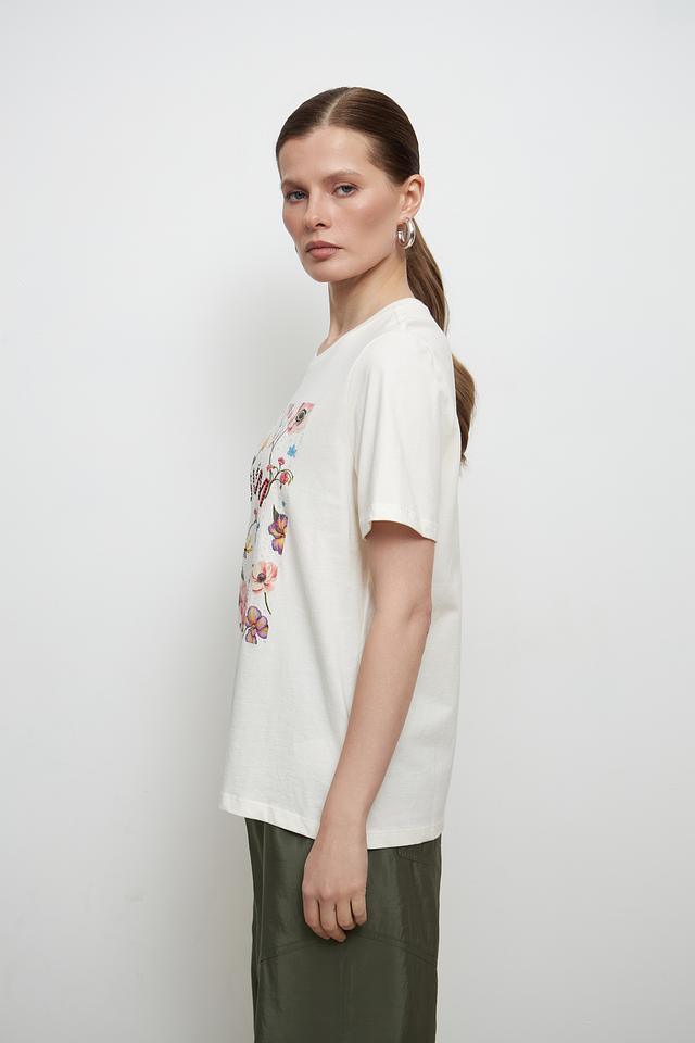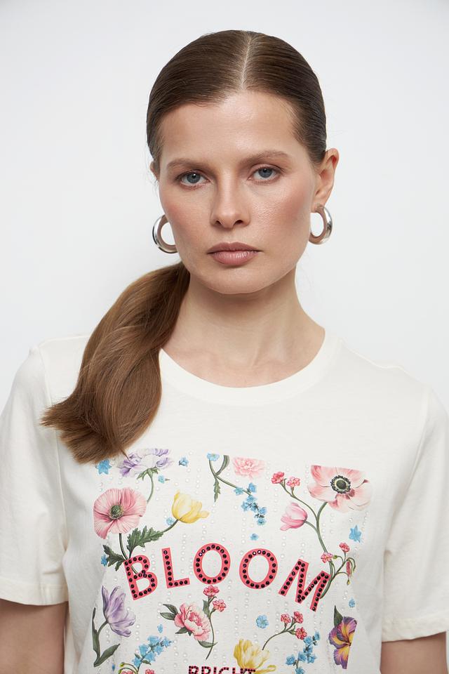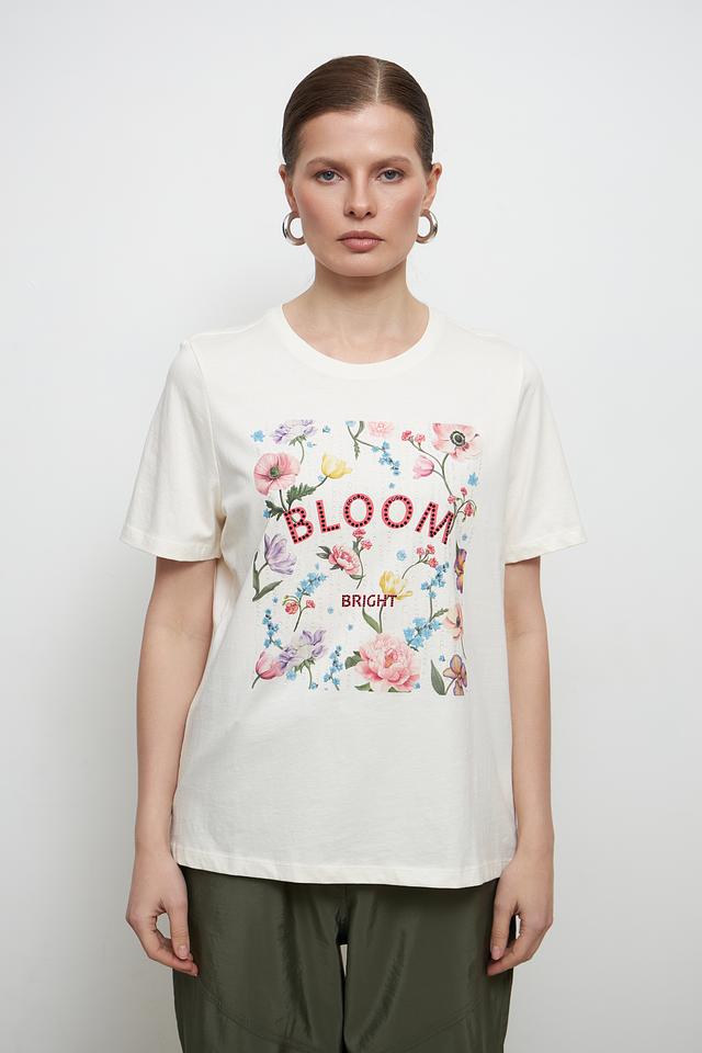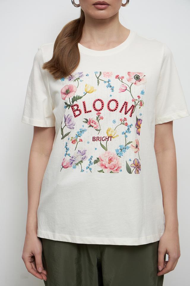 Женская футболка Oui кремового цвета украшена ярким цветочным принтом и надписью "BLOOM BRIGHT". Изготовлена из 100% хлопка, обеспечивая комфорт и воздухопроницаемость. Состав: хлопок 100%