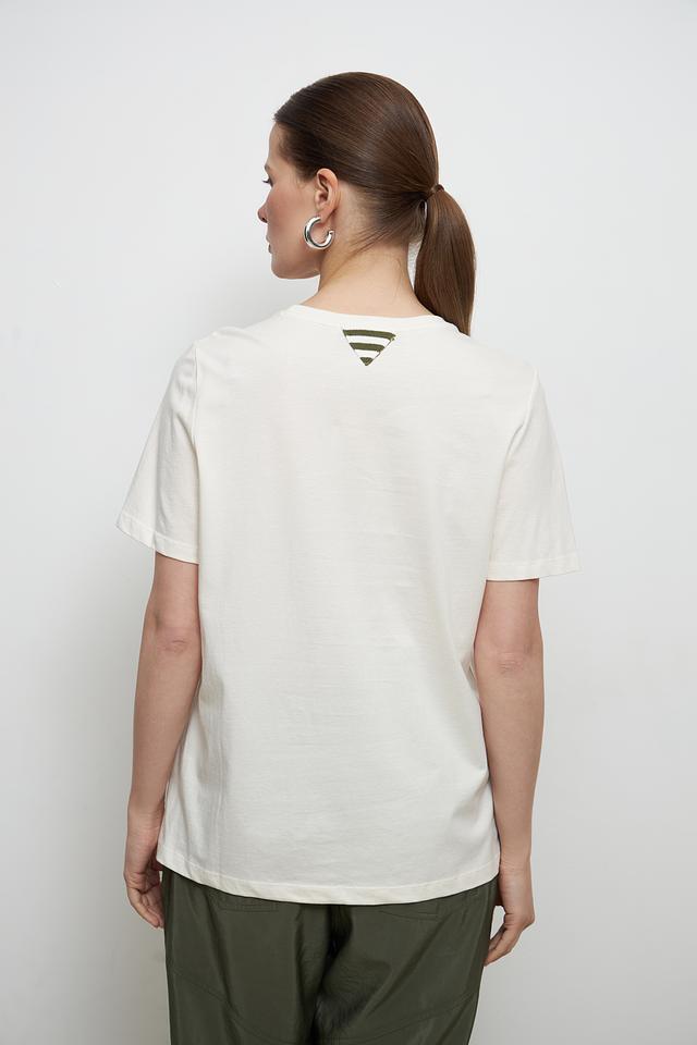 На задней части футболки расположен небольшой логотип бренда. Эта футболка идеально подойдет для создания повседневных образов в сочетании с джинсами, шортами или юбками. Она станет отличным выбором для тех, кто ценит комфорт, стиль и качество.