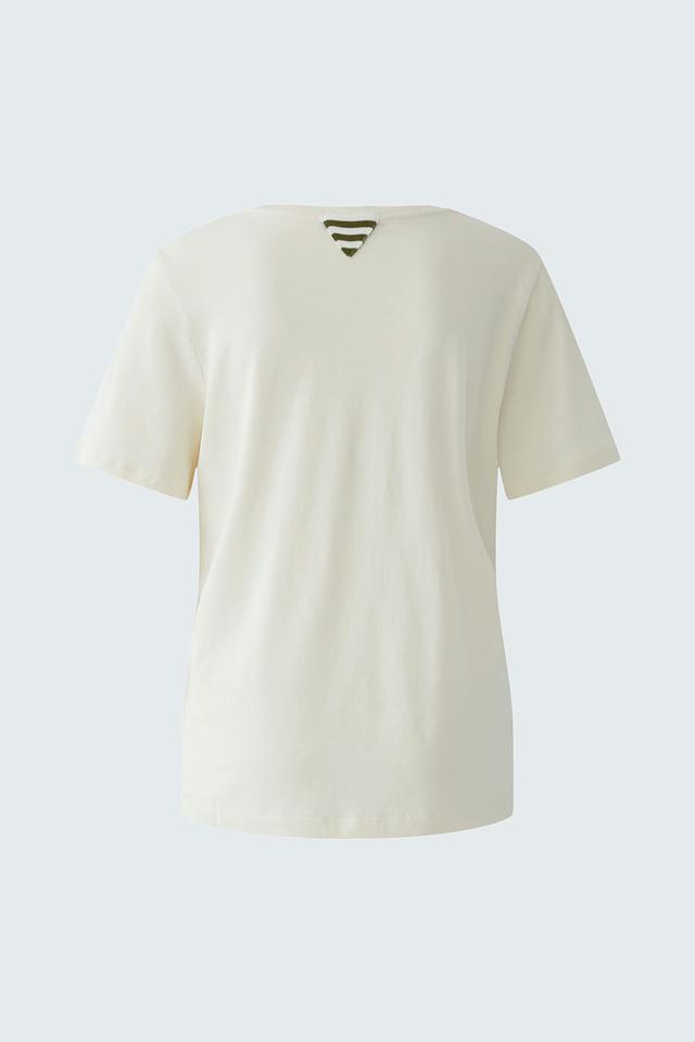 Эта стильная футболка от бренда Oui станет прекрасным дополнением к вашему гардеробу. Футболка выполнена в кремовом цвете и украшена красочным цветочным принтом с надписью "BLOOM BRIGHT", что придает ей свежий и романтичный вид.
