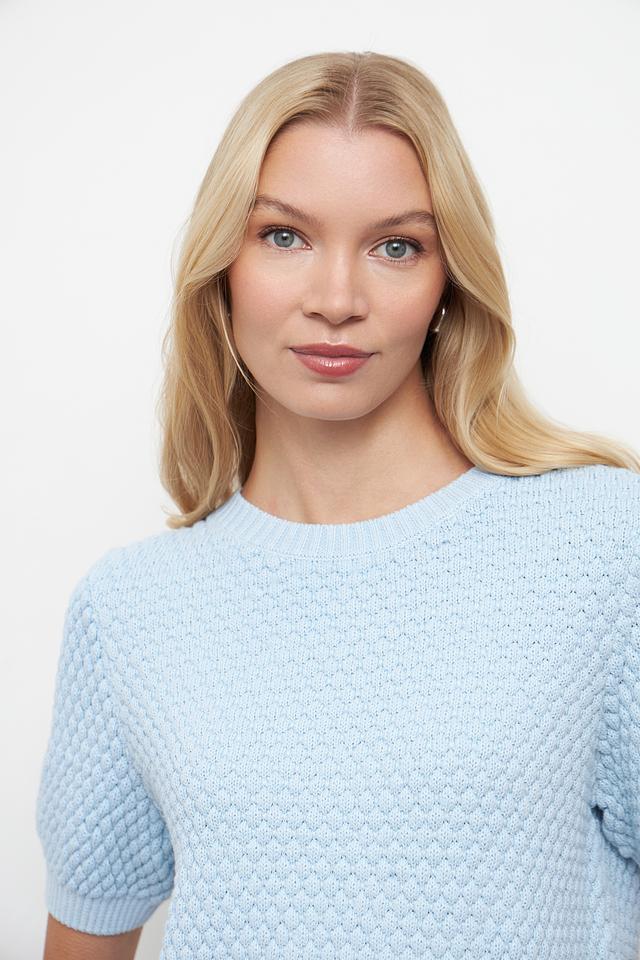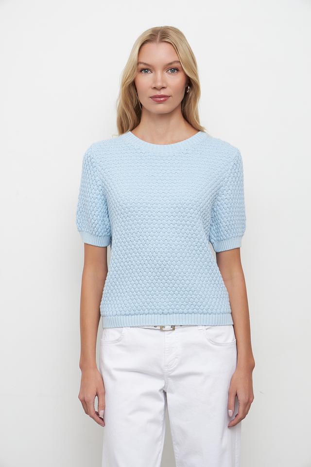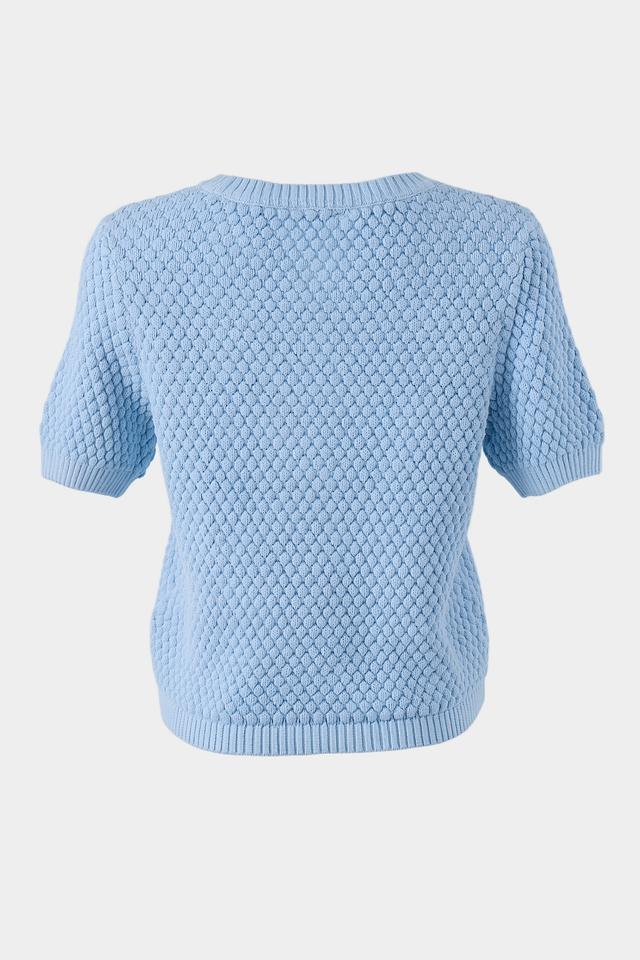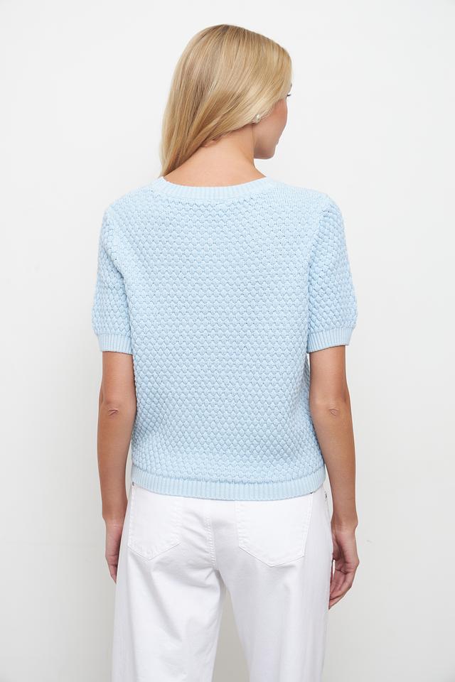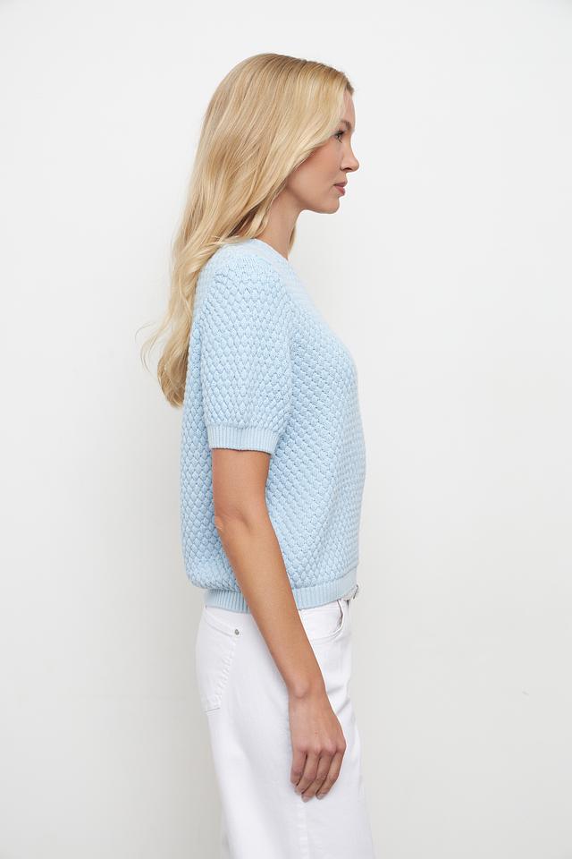 Пуловер имеет нежный голубой цвет и оригинальную фактурную вязку, которая придает ему особый шарм. Короткий рукав делает его идеальным для теплой погоды или для создания многослойных образов.