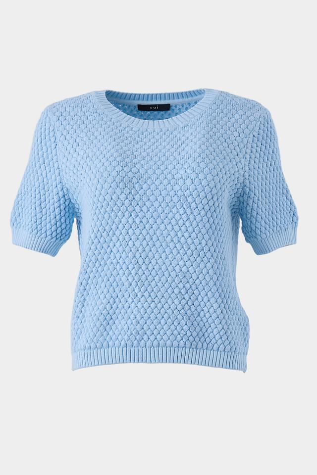 Женский пуловер Oui нежного голубого цвета с коротким рукавом и фактурной вязкой. Модель выполнена из мягкого хлопка с добавлением полиамида для сохранения формы. Идеальный выбор для создания лёгкого и стильного образа. Состав: хлопок 97%, полиамид 3%