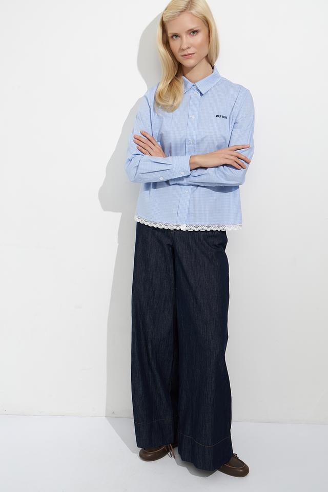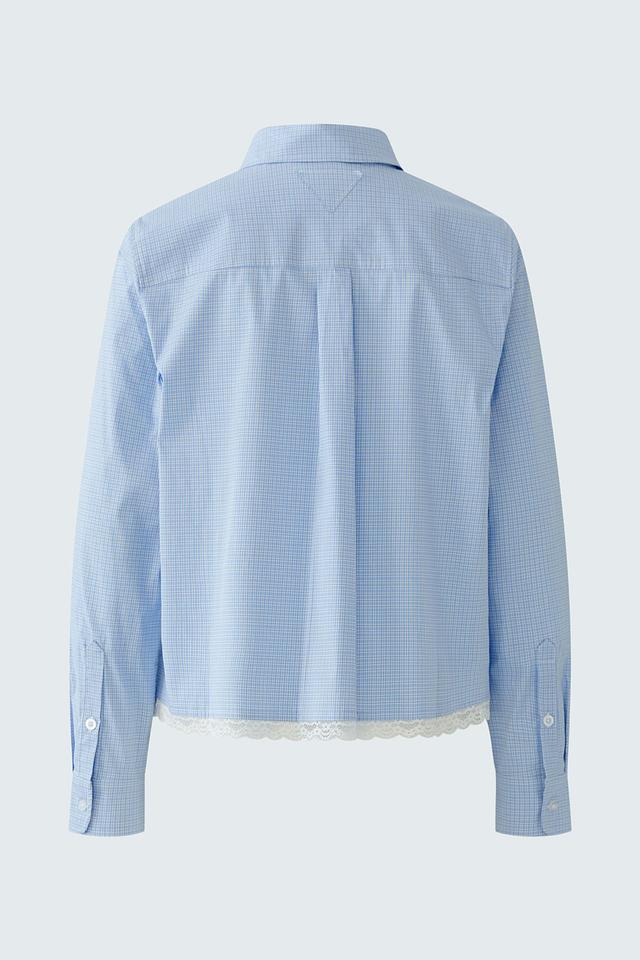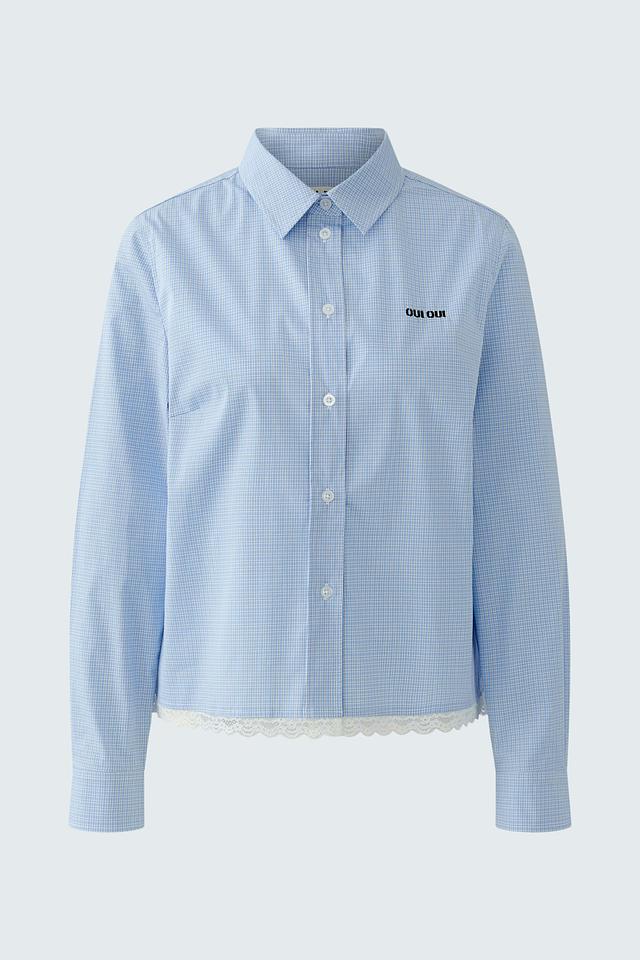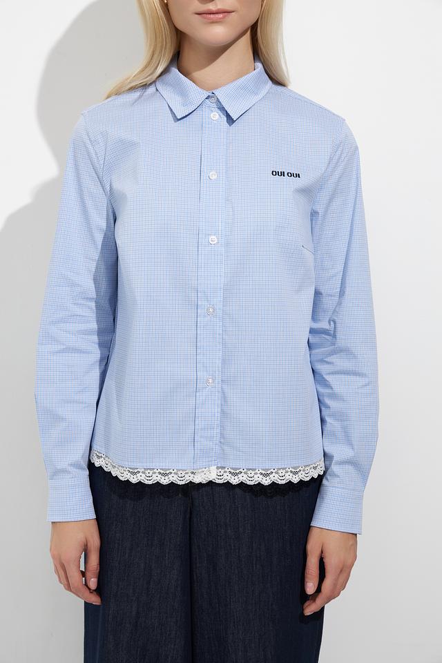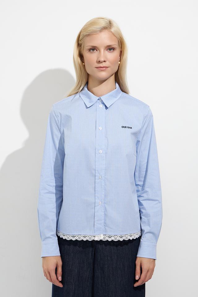 Женская блуза Oui голубого цвета в классическую клетку с длинным рукавом и застёжкой на пуговицы. Модель дополнена кружевной отделкой по низу и небольшим логотипом бренда. Состав: хлопок 77%, полиамид 20%, эластан 3%