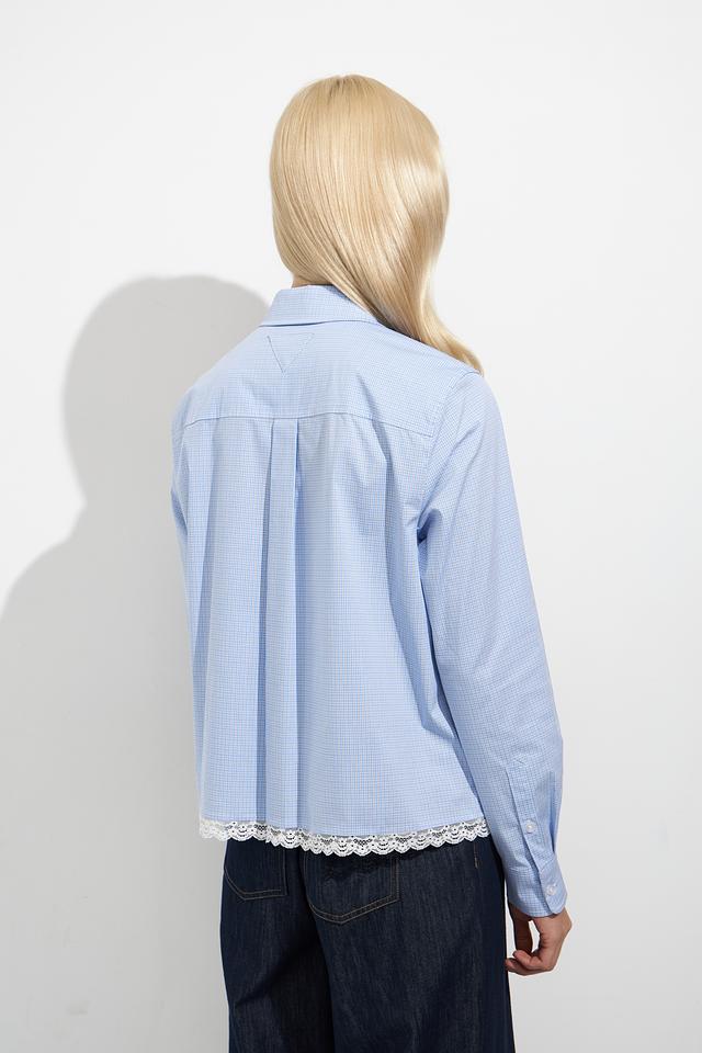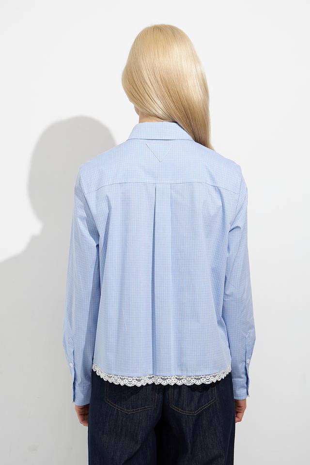 Блуза имеет прямой крой, длинные рукава и традиционную застёжку на пуговицы. Особый шарм ей придаёт кружевная отделка по нижнему краю, добавляющая женственности и изящества.