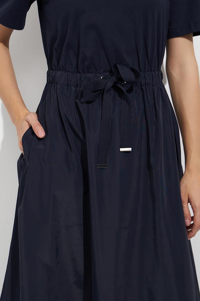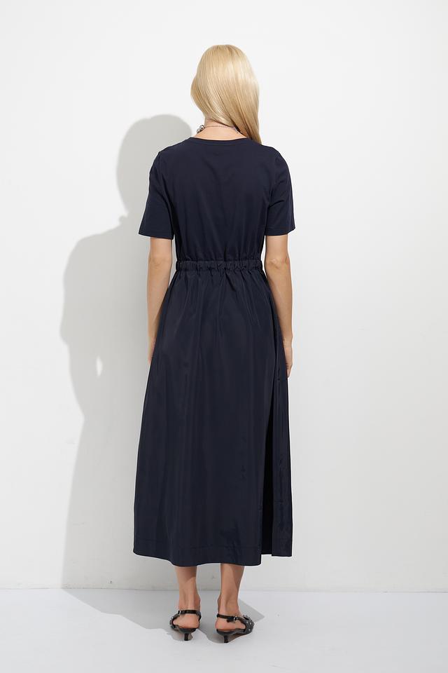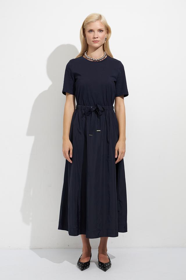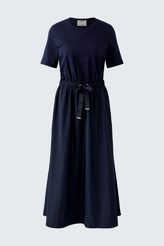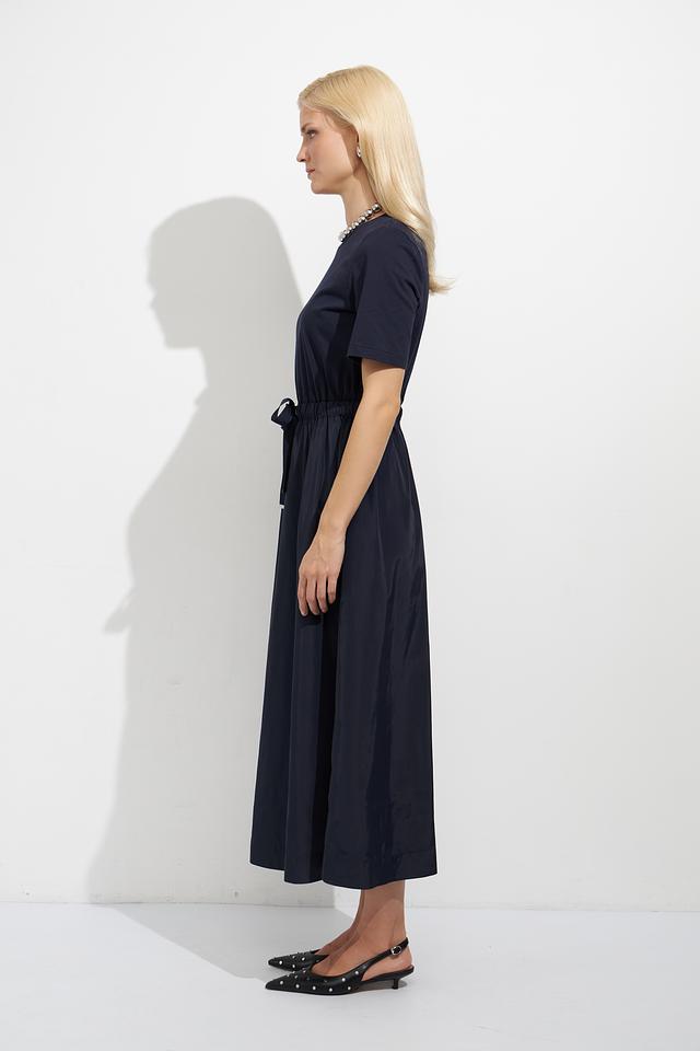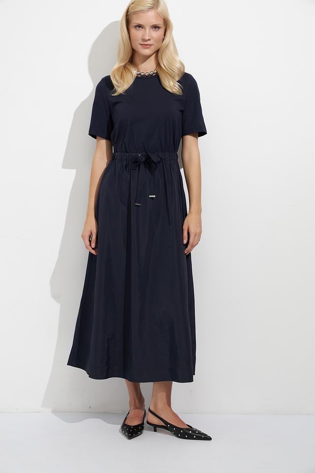 Это платье от бренда Oui выполнено из 100% хлопка, что обеспечивает комфорт и воздухопроницаемость в течение всего дня. Основной цвет платья – темно-синий, который подчеркивает элегантность и универсальность модели.