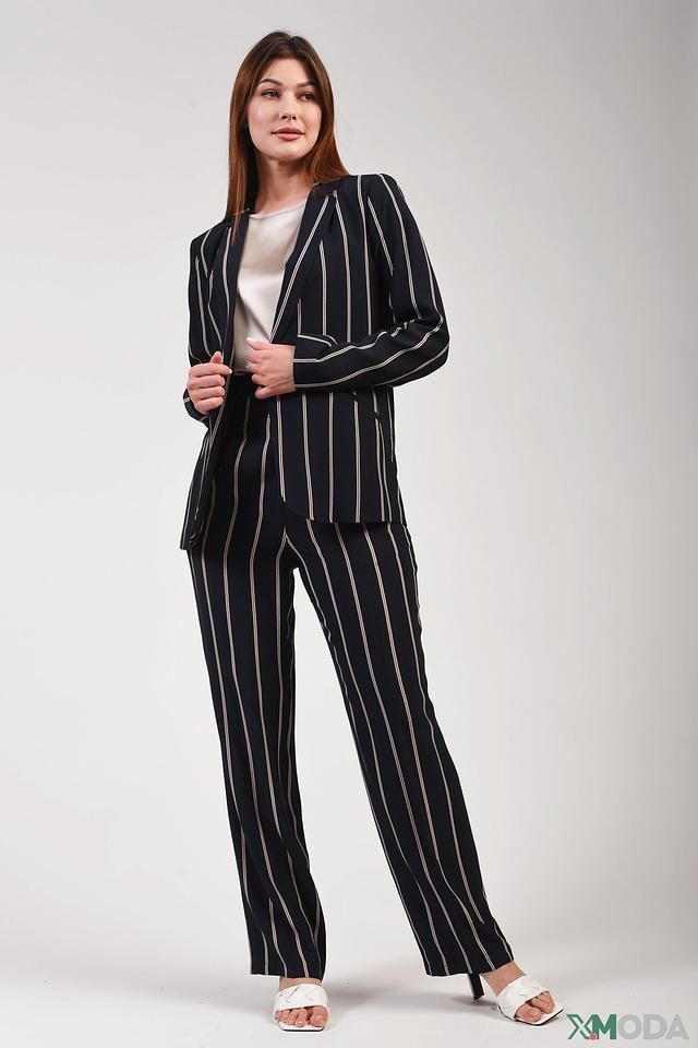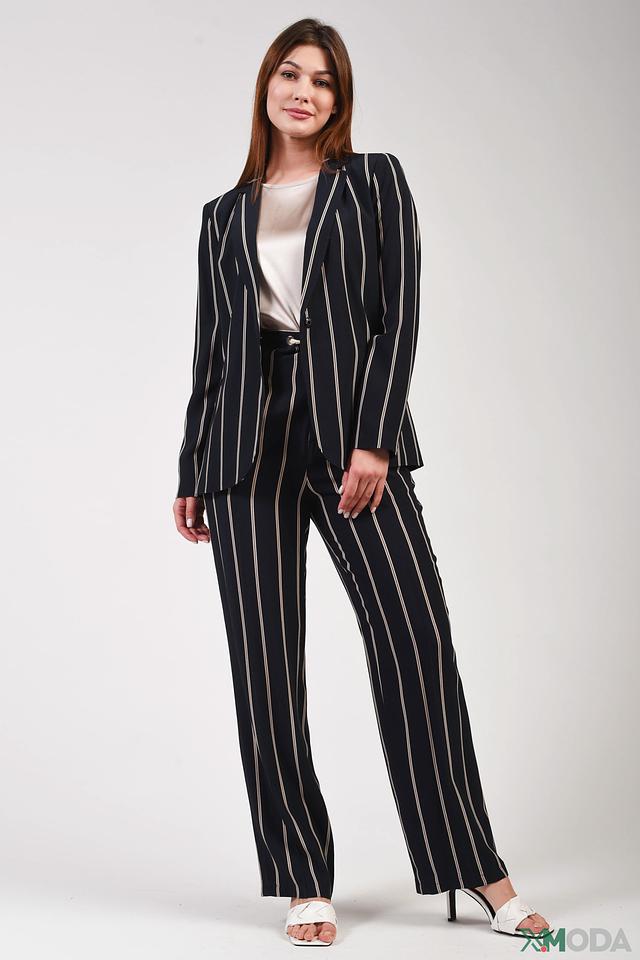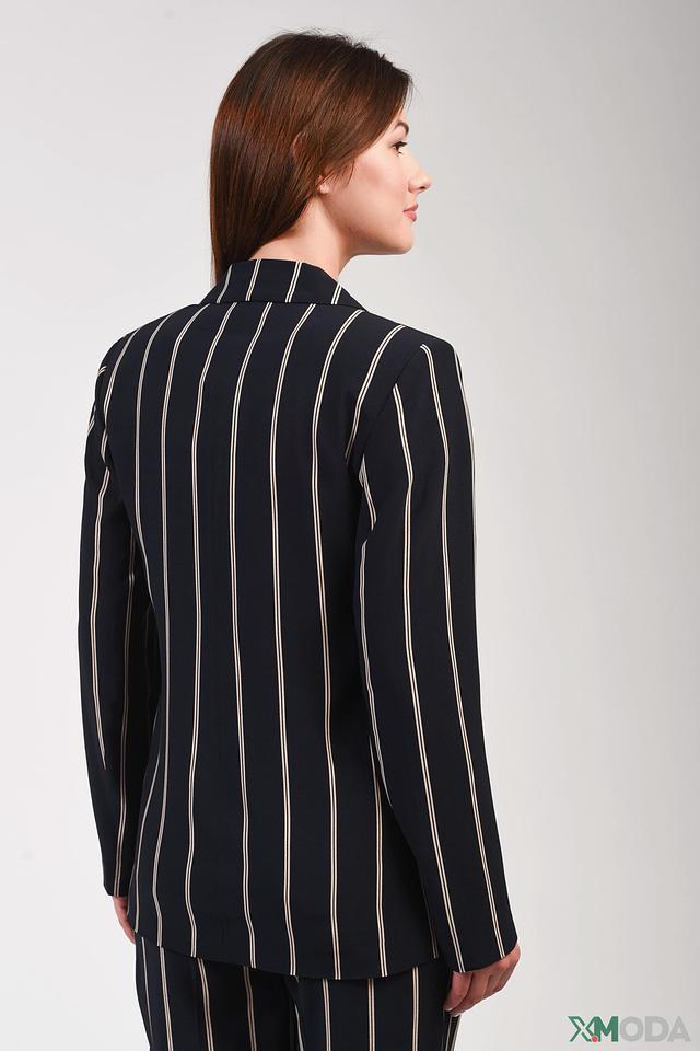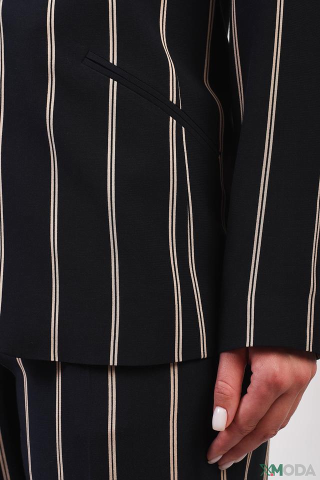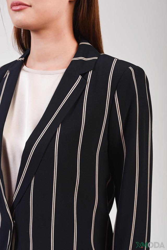Модель имеет прямой крой, классический отложной воротник и длинные рукава. Жакет застегивается на одну пуговицу. Верхняя часть жакета и рукава украшены вертикальной полоской белого цвета на черном фоне.