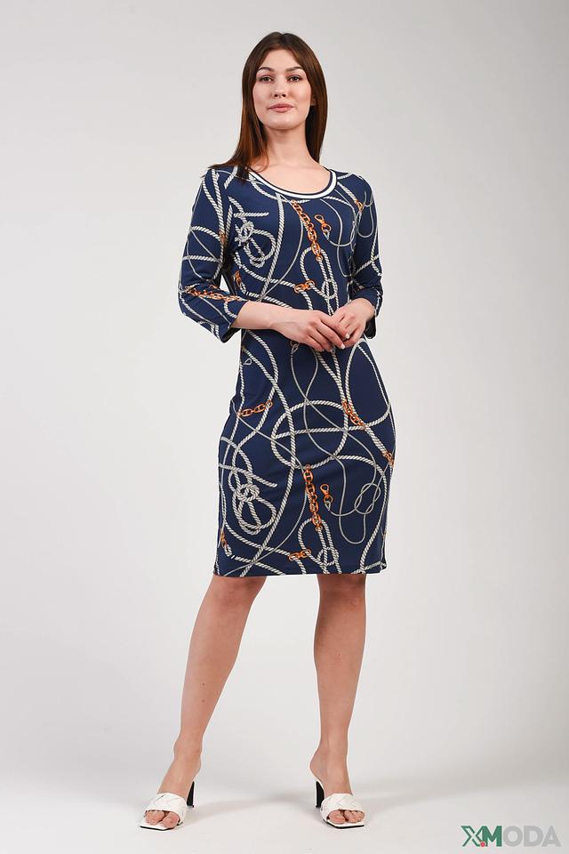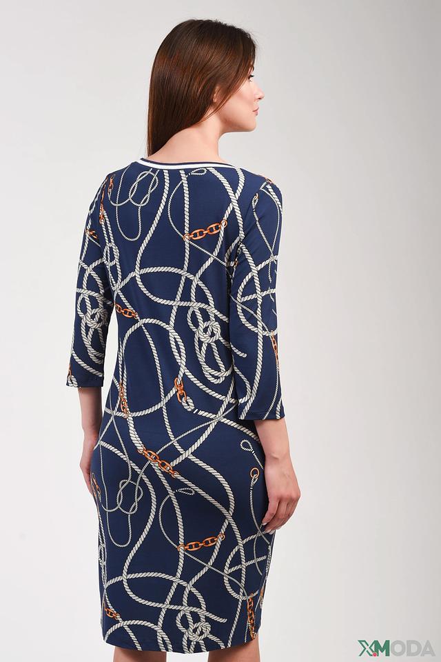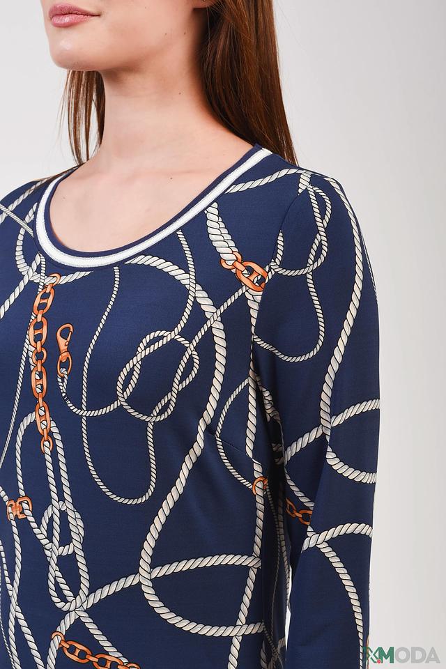 Принт представляет собой комбинацию белых и золотистых элементов, имитирующих морские канаты и цепи. Такой рисунок придает платью оригинальность и динамичность. Платье имеет прямой силуэт, который подчеркивает фигуру, не сковывая движений.