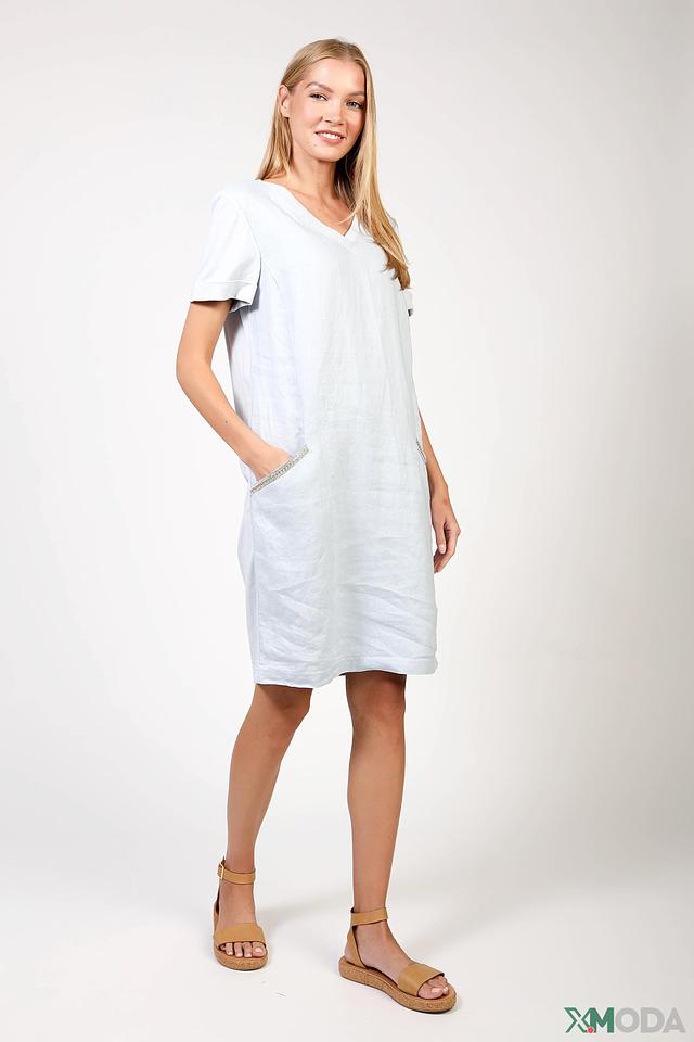 Льняное платье Oui голубого цвета – это комфорт и стиль в одном изделии. Платье свободного кроя с V-образным вырезом и короткими рукавами, украшенное декоративной цепочкой на кармане. Идеальный выбор для летнего гардероба. Состав: лен 100%