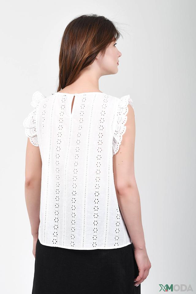 Топ имеет свободный крой и круглый вырез горловины. Особое внимание привлекает изысканная вышивка, покрывающая всю поверхность изделия, и нежные воланы, украшающие рукава.