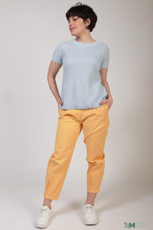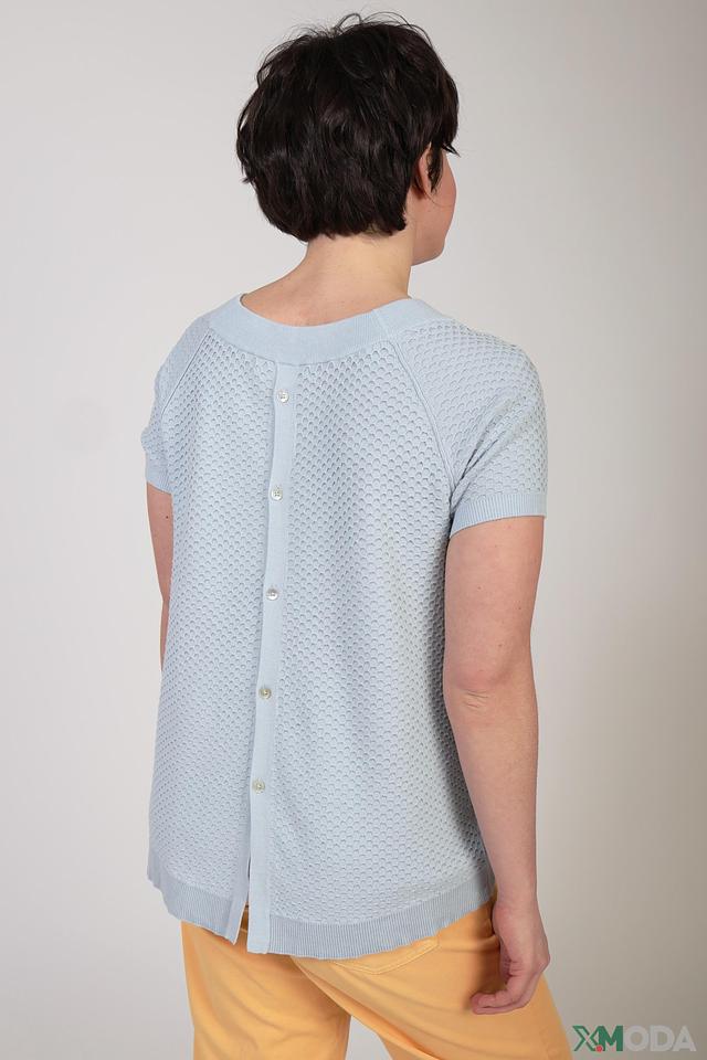 Женский пуловер Oui голубого цвета с коротким рукавом, выполнен из 100% хлопка и имеет фактурную вязку. Модель дополнена застёжкой на пуговицы в задней части. Состав: хлопок 100%