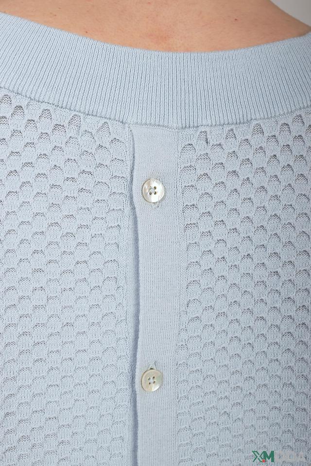 Модель имеет короткий рукав и круглый вырез горловины. Особое внимание привлекает фактурная вязка, которая придает изделию оригинальность и объём. Застёжка на пуговицы в задней части позволяет регулировать посадку и добавляет изысканности.