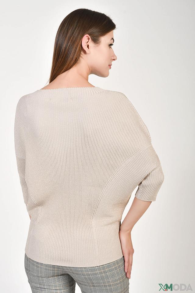 Модель имеет удобный крой с рукавом 3/4 и V-образным вырезом, что делает его универсальным для создания как повседневных, так и более элегантных образов. Текстура изделия выполнена в виде вертикальной вязки, которая визуально вытягивает силуэт.