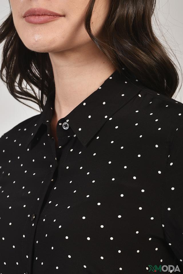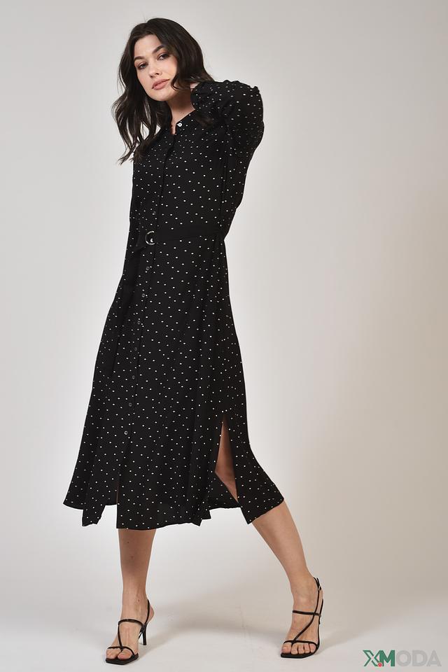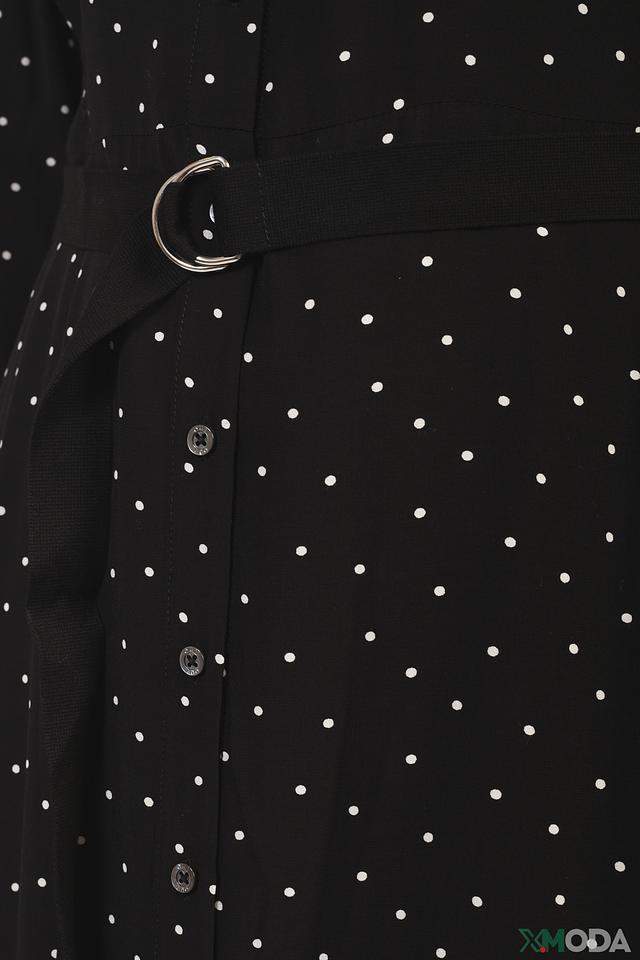 Это стильное платье от бренда Oui выполнено в классическом чёрном цвете и украшено мелким белым горошком, что придает ему игривый и женственный вид. Платье имеет длину миди и прямой крой, который обеспечивает комфортную посадку по фигуре.