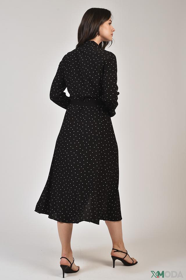 Модель дополнена длинными рукавами и воротником-стойкой, что делает ее подходящей для прохладной погоды или для создания более сдержанного образа. Пояс в комплекте позволяет подчеркнуть талию и создать более женственный силуэт. Платье застегивается на пуговицы по всей длине.