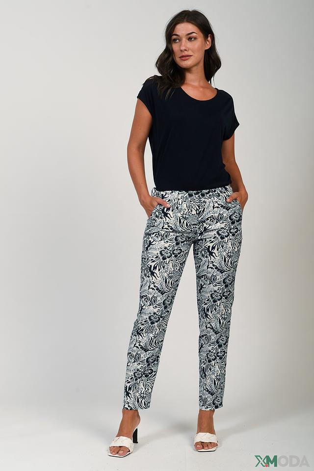 Особенностью модели является яркий цветочный принт в бело-синей гамме, который придает образу женственность и свежесть. Брюки имеют удобный эластичный пояс, обеспечивающий комфортную посадку. Прямой крой и слегка укороченная длина делают их универсальными для создания различных образов.